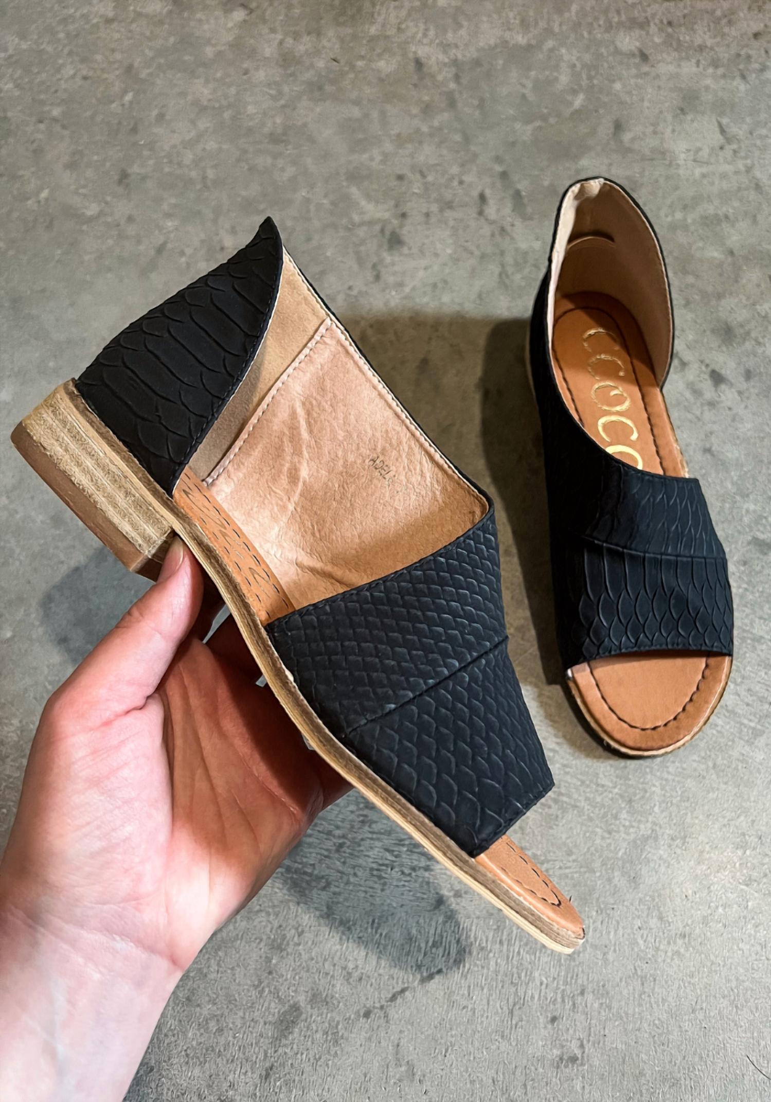 A classic loafer that is both comfortable and polished.Walk through your day wearing our open toe and side cut-out flats! These have a black snake print texture and a 1" heel.Fit: True to size.