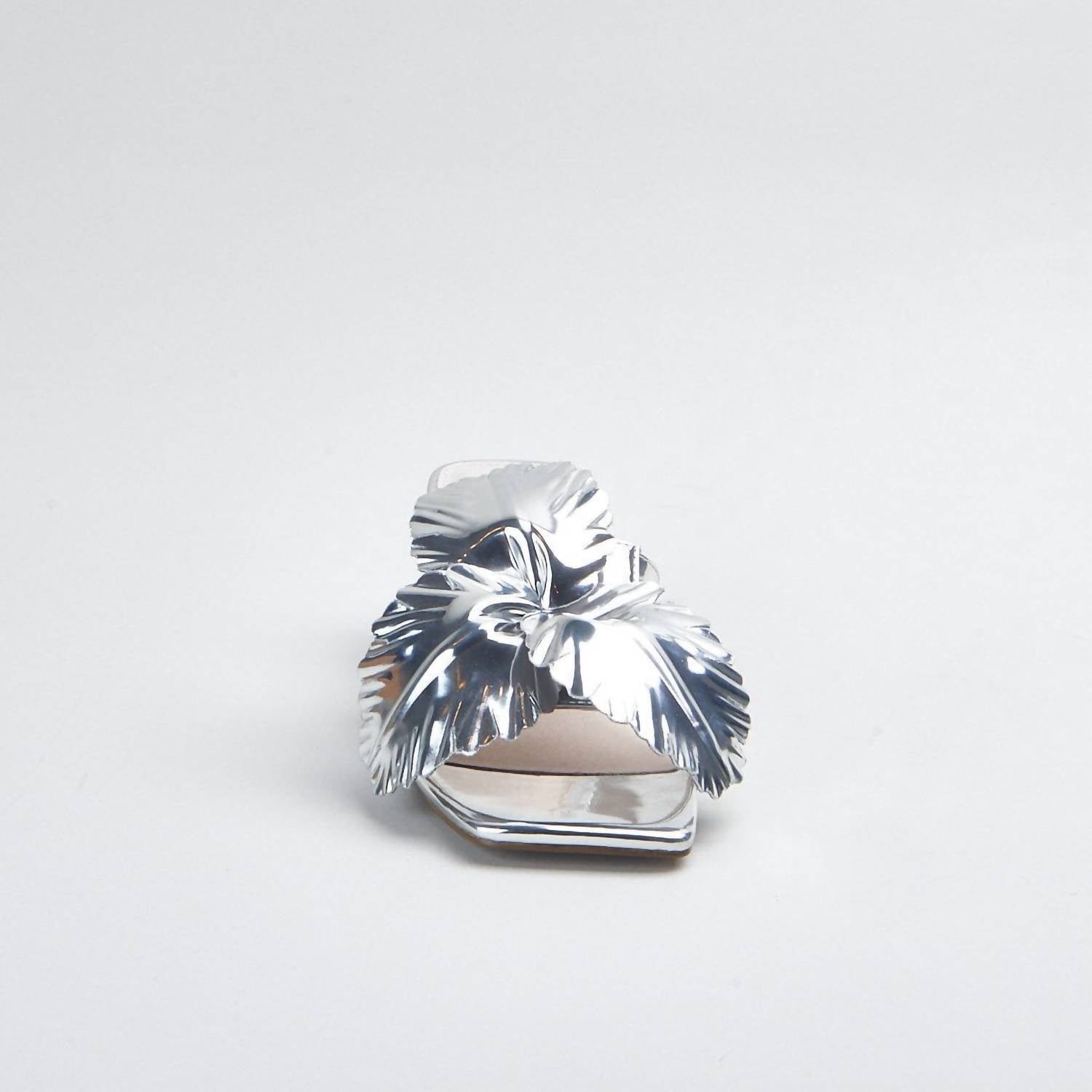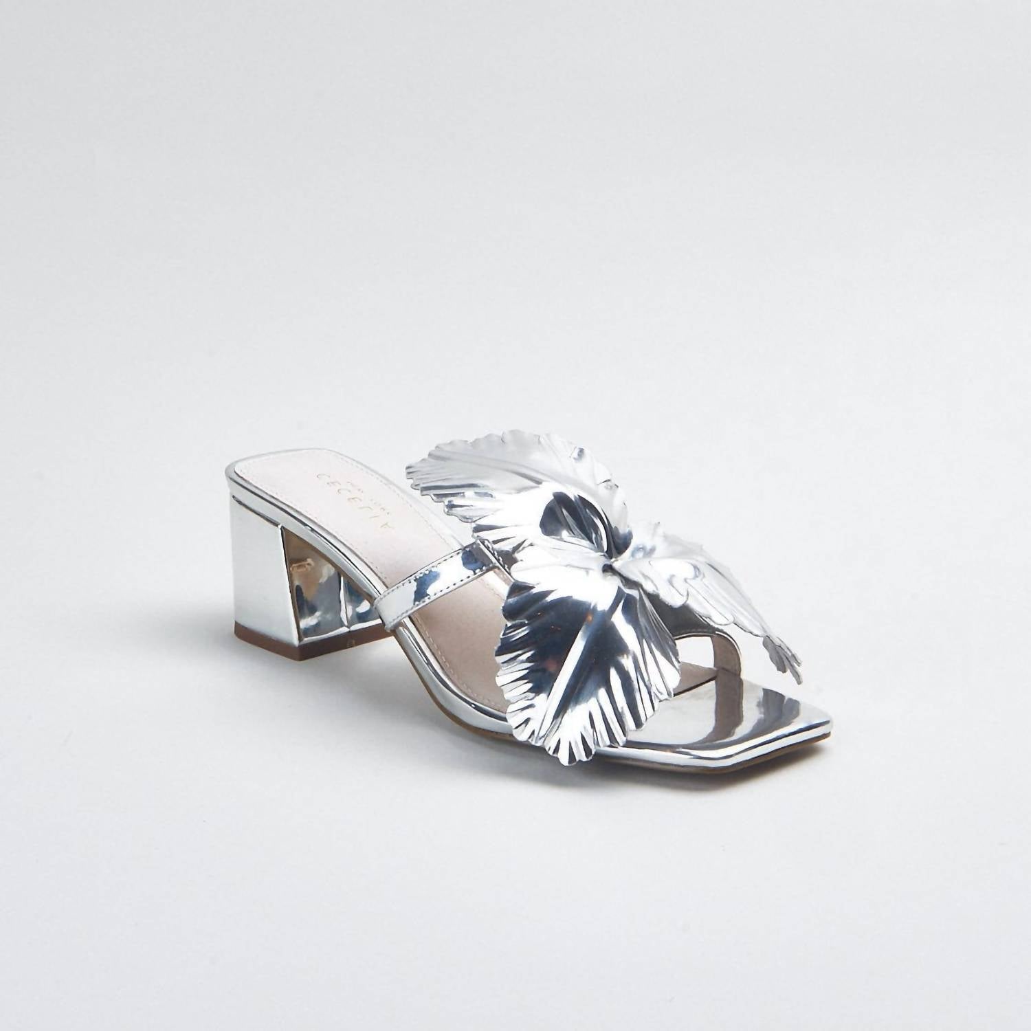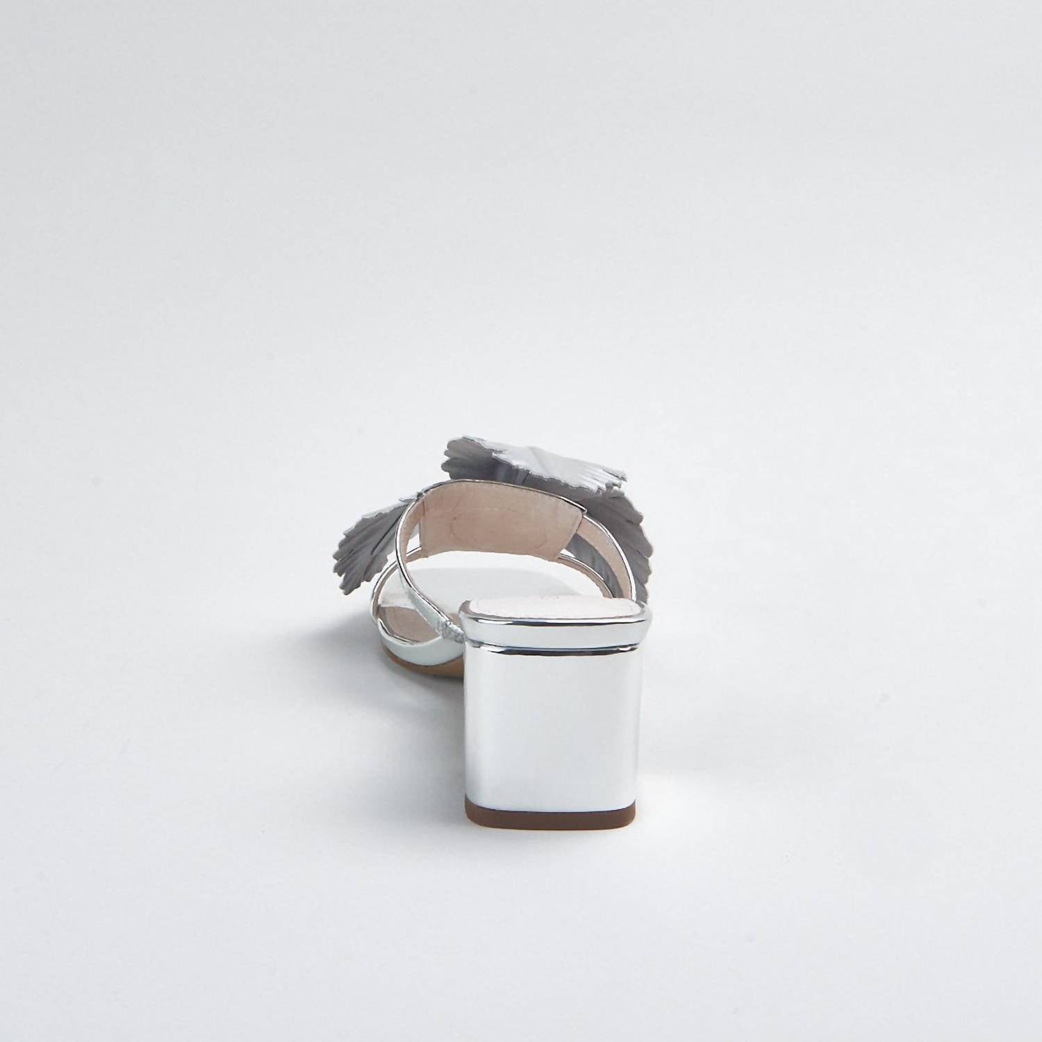 This sandal will take you from brunch to dinner and everything in between. Step into elegance with the Women's Happy Sandals by CECELIA NEW YORK, a chic choice for minimalist style. These silver block heel mules feature a bold flower embellishment at the center, complemented by a 2.25" heel height. Perfect for summer dinner parties or Thanksgiving gatherings, these open-toe sandals add a touch of sophistication to any outfit. Ideal for women seeking a stylish yet comfortable option with its flat heel classification.
