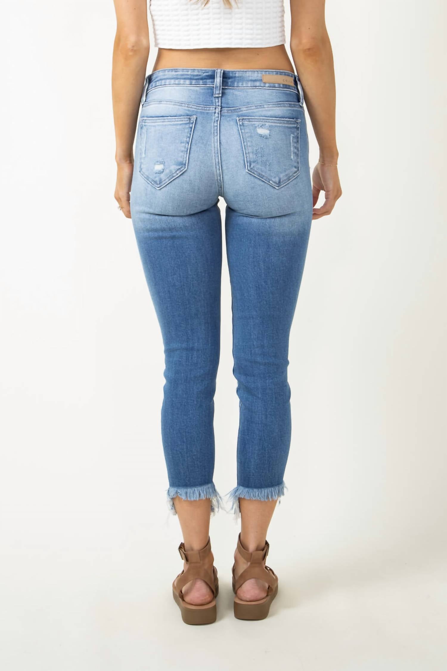 A skinny jean that is both flatering and comfortable. We love this style because it works great with boots, or without! Skinny jeans. Destruction on front and knees . High rise waist. Frayed ankle hem. Cropped, ankle length hem. 99% Cotton 1% Spandex.