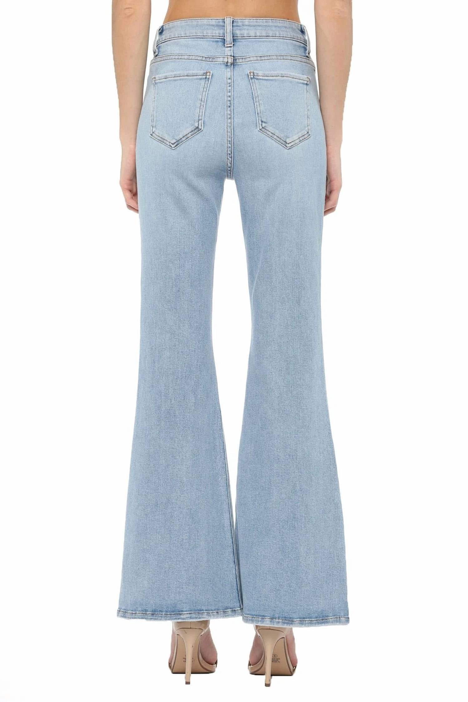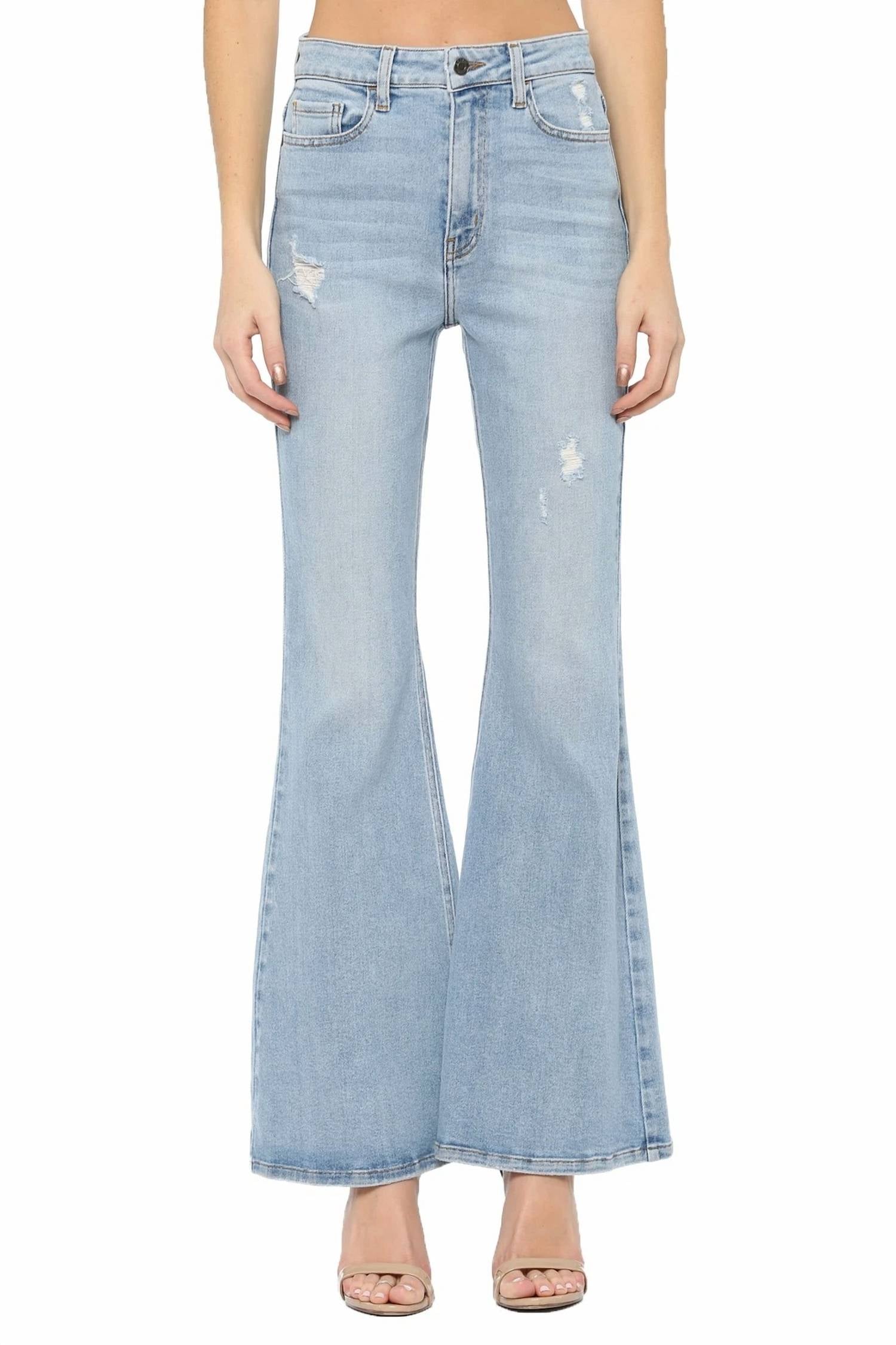 Pair these wide leg jeans with mules, slides or your favorite strappy sandals. Introducing the High Rise Distressed Super Flare Jeans by CELLO, the perfect denim piece for your summer vacation wardrobe. Crafted from a durable cotton blend, these jeans feature a solid pattern with a flared leg design for a trendy 90s fashion statement. The slim fit enhances your silhouette, and the button closure ensures a secure fit. With a 33-inch inseam and practical pockets, care is easy as just lay flat to dry.