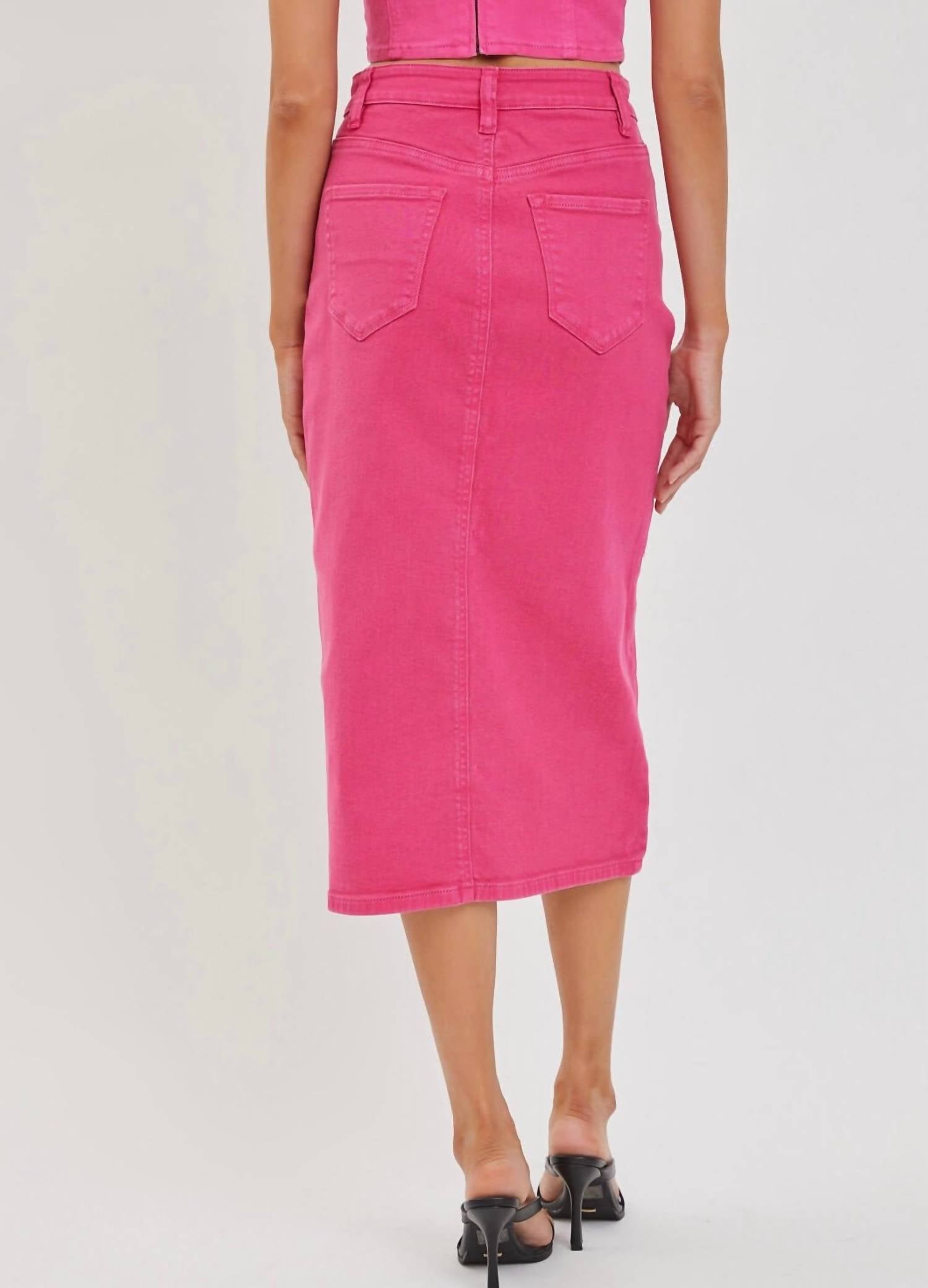 Show off just the right amount of skin in this beautifuly designed midi length skirt. Embrace effortless style with the Paylon Denim Midi Skirt by CELLO, crafted in a chic pink hue perfect for spring. Featuring a high-rise fit and a relaxed, comfortable silhouette, this skirt includes a playful front slit and four practical pockets. Material: 93% Cotton, 5% Polyester, 2% Spandex. Closure: Zip fly. Care: Machine wash, tumble dry. Length: C.F Length 30 1/2", C.B Length 31 1/2". Available in sizes X-Small to Large, with a true-to-size fit.