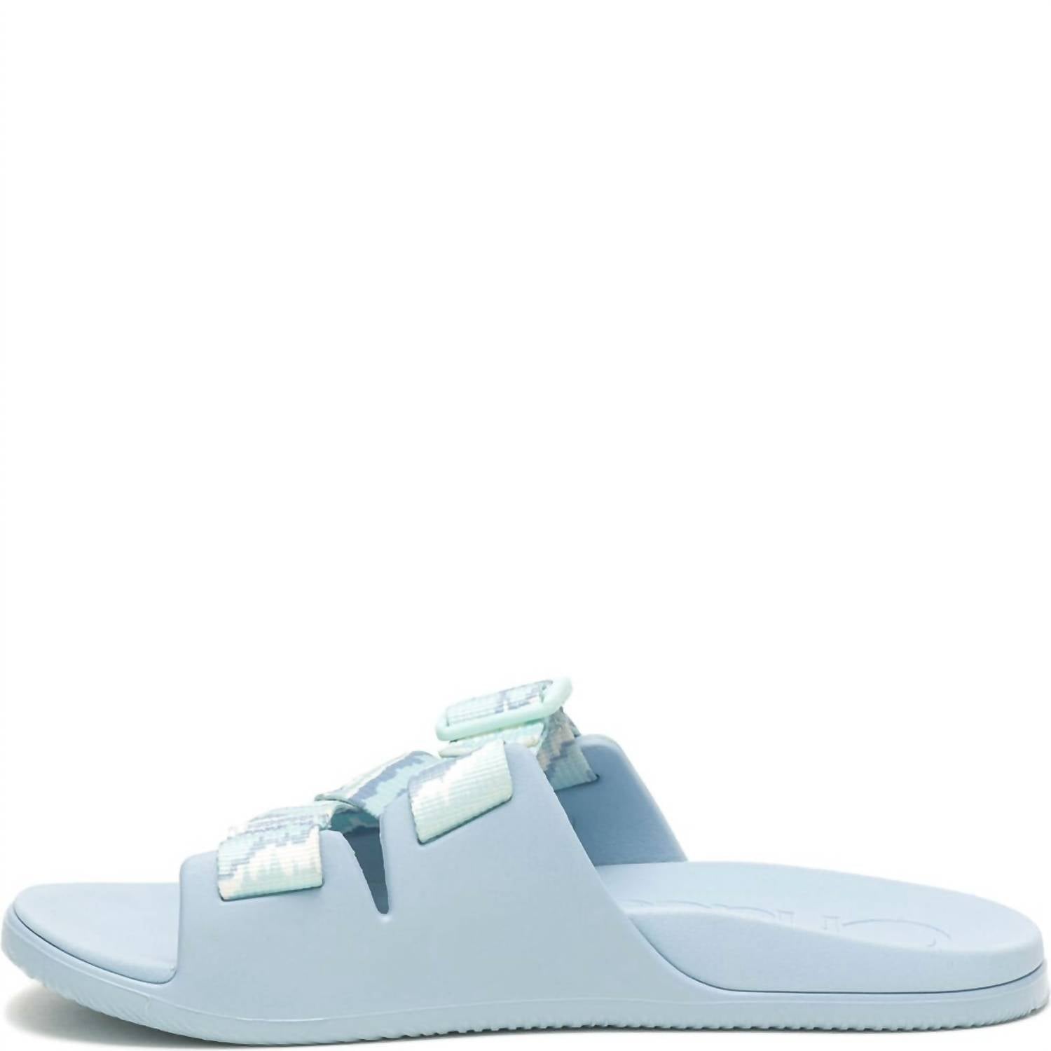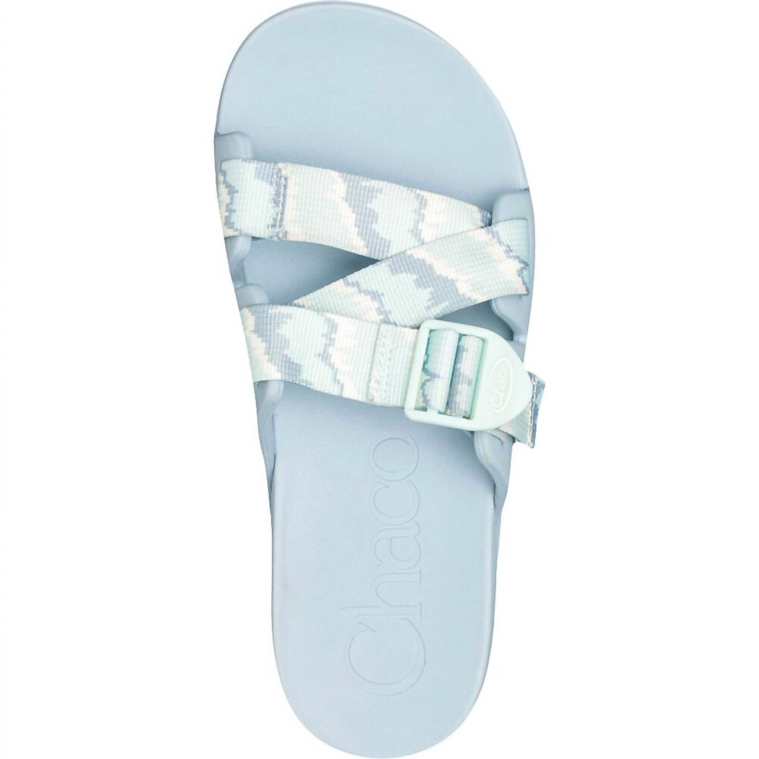 This sandal will take you from brunch to dinner and everything in between. Introducing the Women's Chillos Slide Sandal by Chaco, crafted in a stylish Tinge Sky Blue. These sandals feature an adjustable polyester jacquard webbing upper secured with an injection molded ladder lock buckle, providing a customizable fit. They boast a midsole with podiatrist-accepted LUVSEAT™ arch support for healthy alignment, making them both comfortable and vegan-friendly. The high abrasion EVA outsole is designed with a wave fin traction pattern, ensuring durability and grip. Available in medium width, these open-toe sandals offer a blend of style and function for any adult wardrobe.