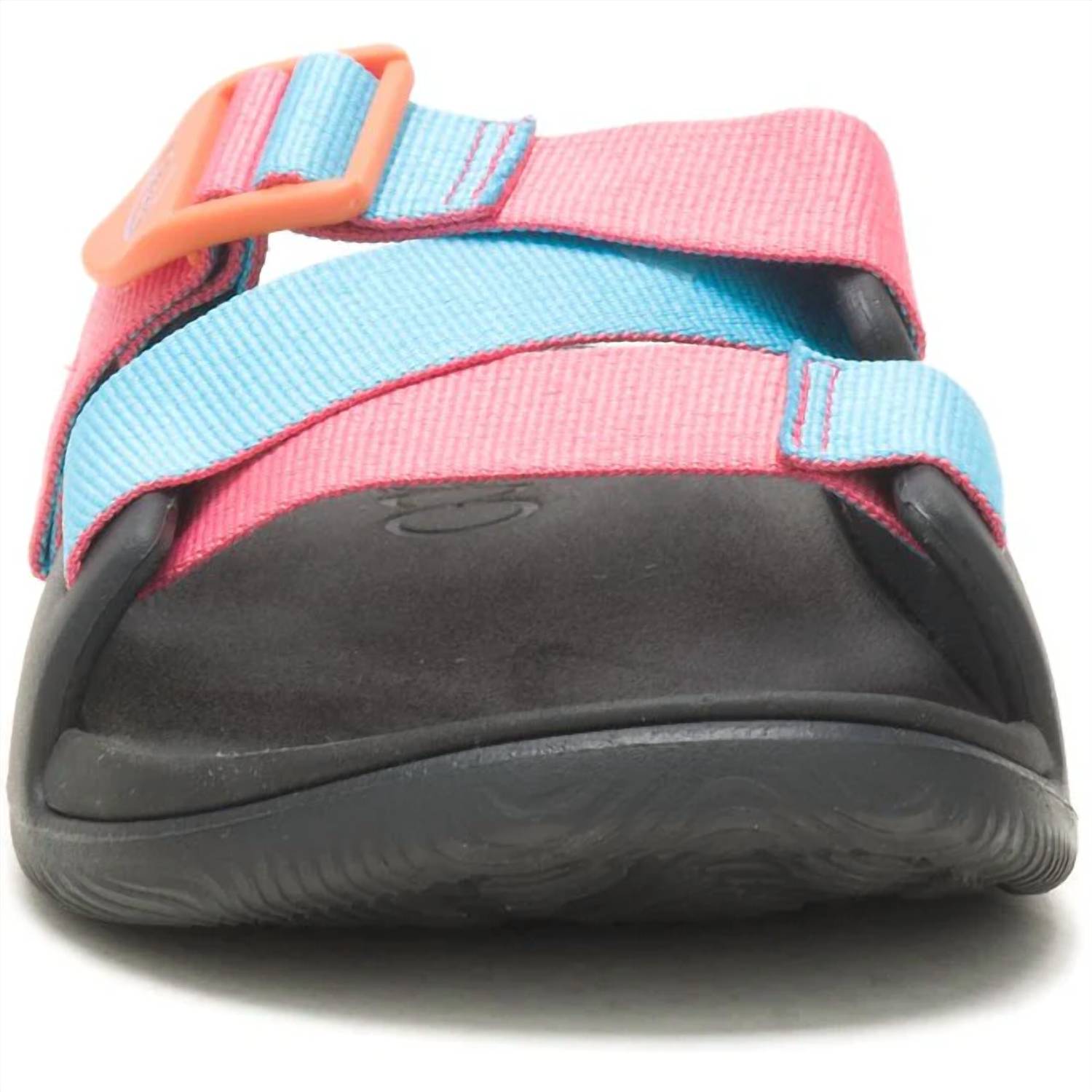 Classicly cute and all-day-wearable. We love this sandal. Elevate your relaxation with the Women's Chillos Slide Sandal by Chaco in a captivating Rose Blue. Featuring an adjustable polyester jacquard webbing upper with an injection molded ladder lock buckle, these slides ensure a secure and comfortable fit. The podiatrist-accepted LUVSEAT™ arch support in the midsole promotes healthy alignment, while the vegan-friendly construction is both earth-conscious and stylish. The sandal's high abrasion EVA outsole with wave fin traction design offers durability and grip, all in a flat heel style perfect for all-day wear. Ideal for lounging by the pool or lounging post-yoga, these slides are your new go-to for comfort and style.