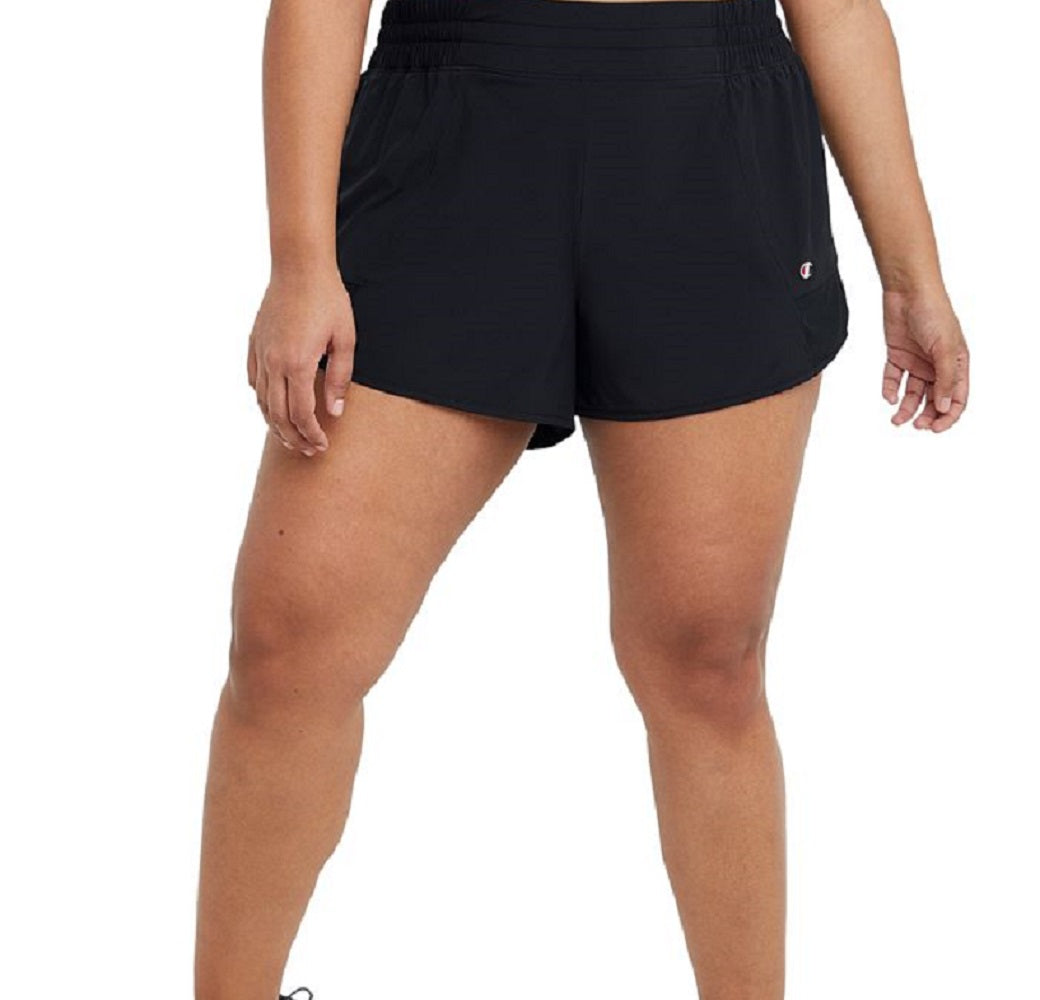 Team up your T-shirt and tanks with these plus size shorts from Champion| featuring moisture-wicking technology.| Approx. inseam; 4| DOUBLE DRY® wicking for moisture management; odor control| Pull-on style; interior drawstring; built-in liner; logo at hem| Polyester (87% recycled)/spandex| Machine washable