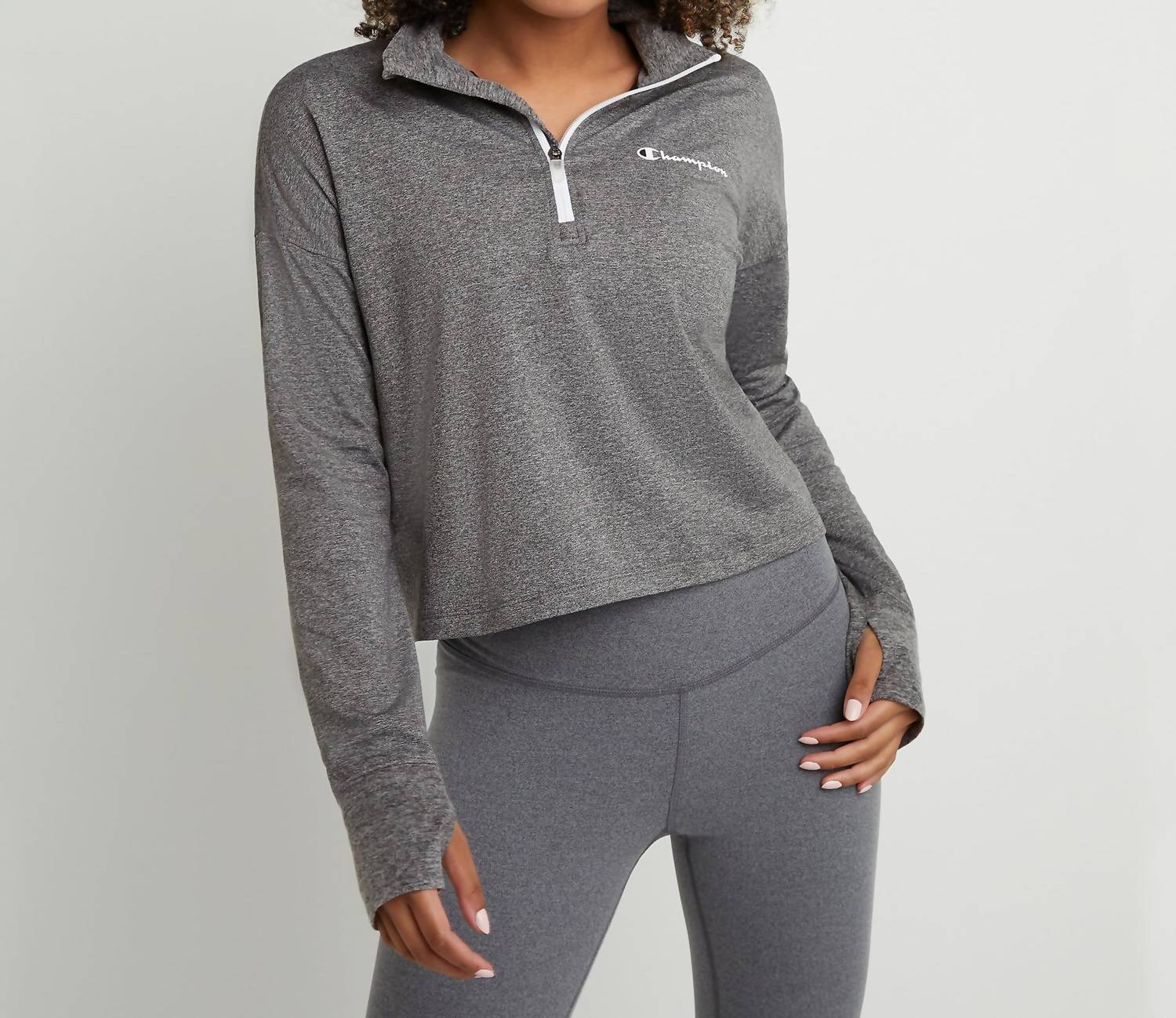 Whether you're running around town or lounging at home, this sweatshirt works for both. WORKOUT TO ATHLEISURE This Soft Touch 1/4 Zip Pullover is just the fit for post-workout to weekend errands - made with a buttery-soft stretch fabrication that moves with you with moisture-wicking technology to keep you cool and comfortable. This standard fit, lightweight top has a mock neck with 1/4 zip and convenient thumb holes offering a sporty, on-trend look. Classic script sits in the center chest of this women's sweatshirt while the iconic C hits at the wrist.