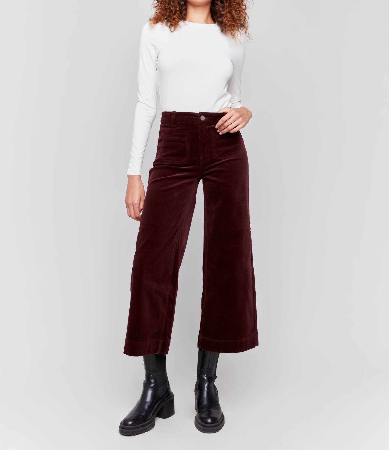 Stay on trend with these stylish boot cut pants that are fit to perfection. The perfect combination of comfort and fashion, you'll be grabbing for these all season long! Elevate your fall wardrobe with the Corduroy Front Patch Pocket Flare Leg Pant by CHARLIE B, a perfect blend of vintage charm and modern style in a rich burgundy hue. Featuring a mid-rise and regular fit with a stylish flare leg and 12" leg opening, these pants are crafted from a 98% cotton and 2% spandex blend for comfort and flexibility. Closure: Button closure. With an inseam of 27", they're versatile enough for travel or holiday occasions. Care: Machine wash in cold water, do not bleach, hang to dry, iron at low setting, dry clean if needed.