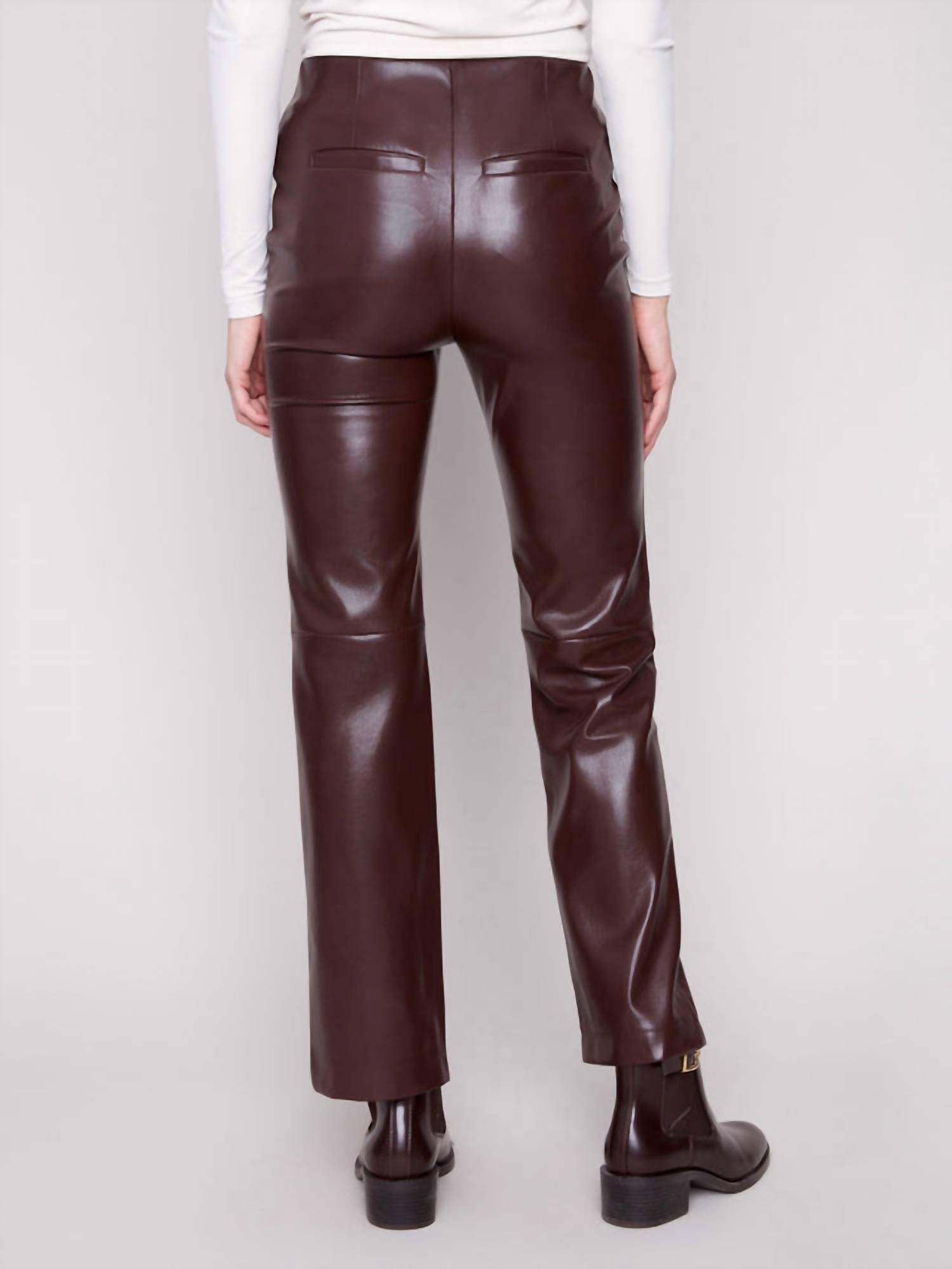 A straightleg pant that workes season after season. Dress these up with your favorite blouse or keep it casual with your go-to tee. Elevate your wardrobe with the Faux Leather Pull-on Pants by CHARLIE B, crafted in a rich Cabernet hue. These high-rise straight-leg pants feature a pull-on closure for effortless wear. They're composed of 100% Polyurethane with a 30.5" inseam and a 9" leg opening, providing a sleek and modern fit. Care instructions include hand washing in cold water, hanging to dry, and avoiding ironing and dry cleaning for long-lasting style.