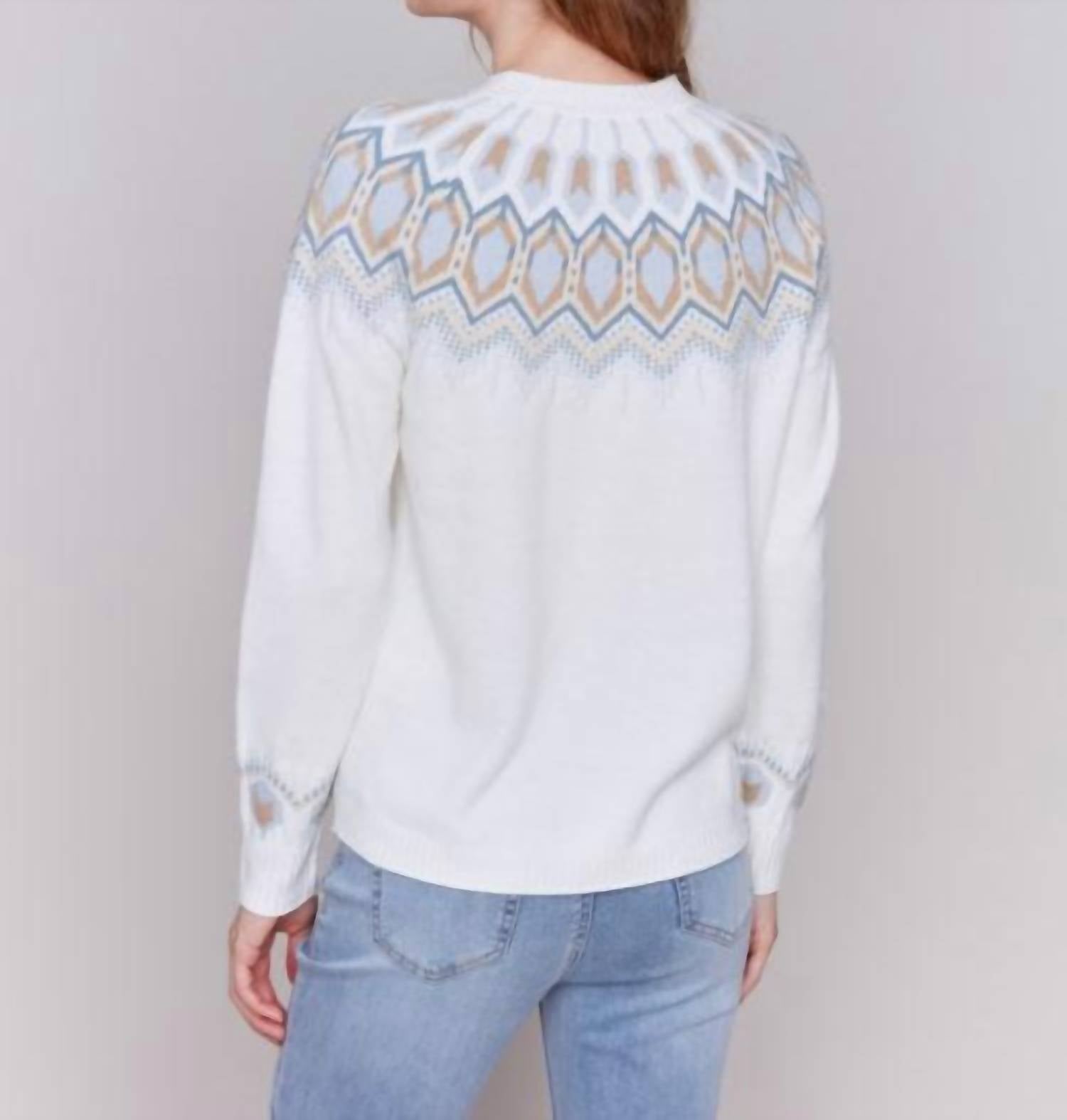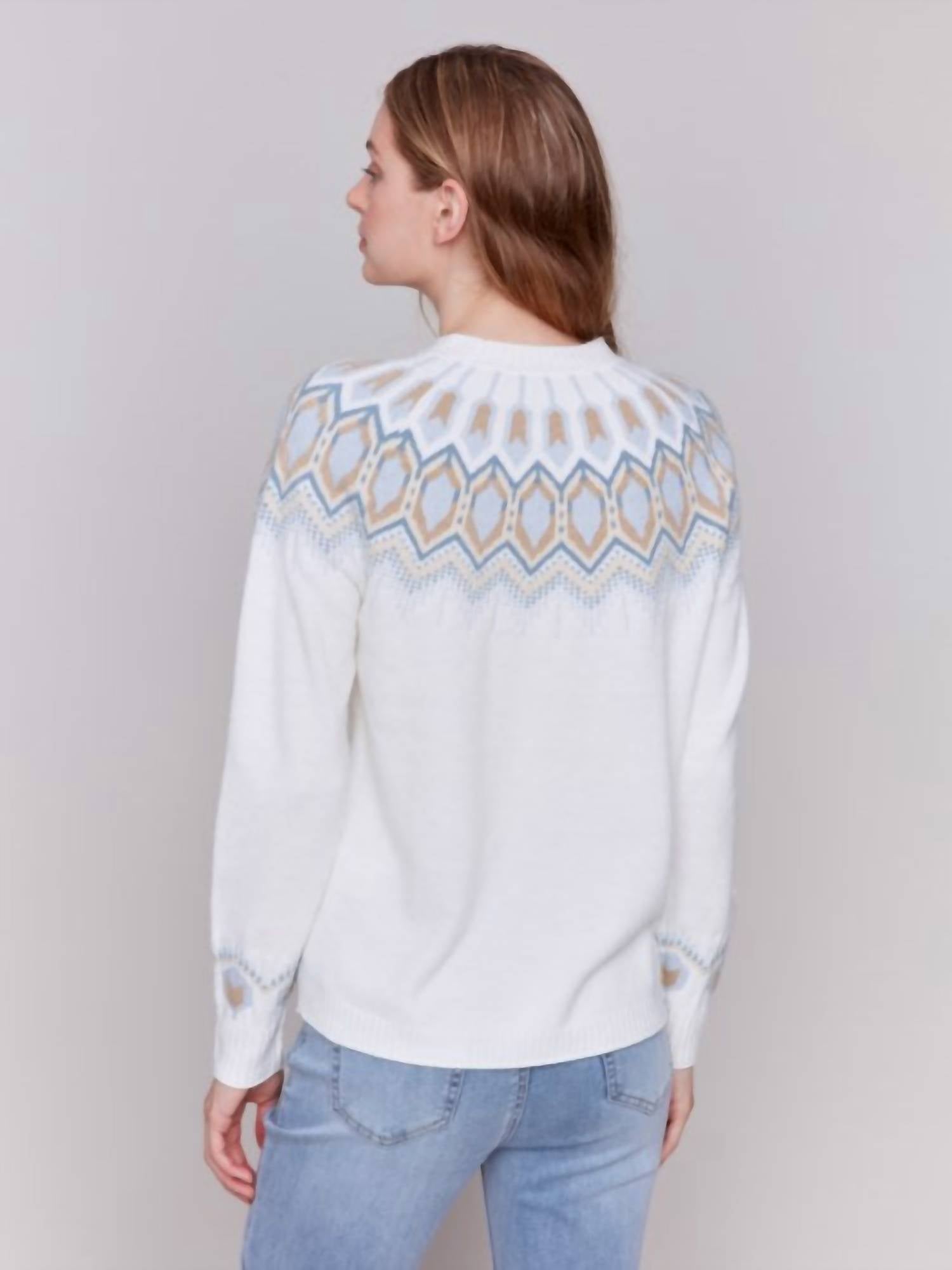 Experience the perfect blend of comfort and style with this trendy crew neck sweater, designed to effortlessly elevate your wardrobe. Pair it with your favorite denim and loafers for the perfect look. Introducing the Plush Jacquard Ski Raglan Sweater by CHARLIE B, a chic addition to your fall wardrobe. This women's long sleeve sweater features a geometric jacquard design in a soft cream hue, crafted from 77% acrylic, 20% nylon, and 3% spandex for warmth and comfort. The back measures 24 1/2" in length and offers a classic crewneck style with a convenient button closure. Care instructions include hand washing in cold water, laying flat to dry, and ironing at a low setting.