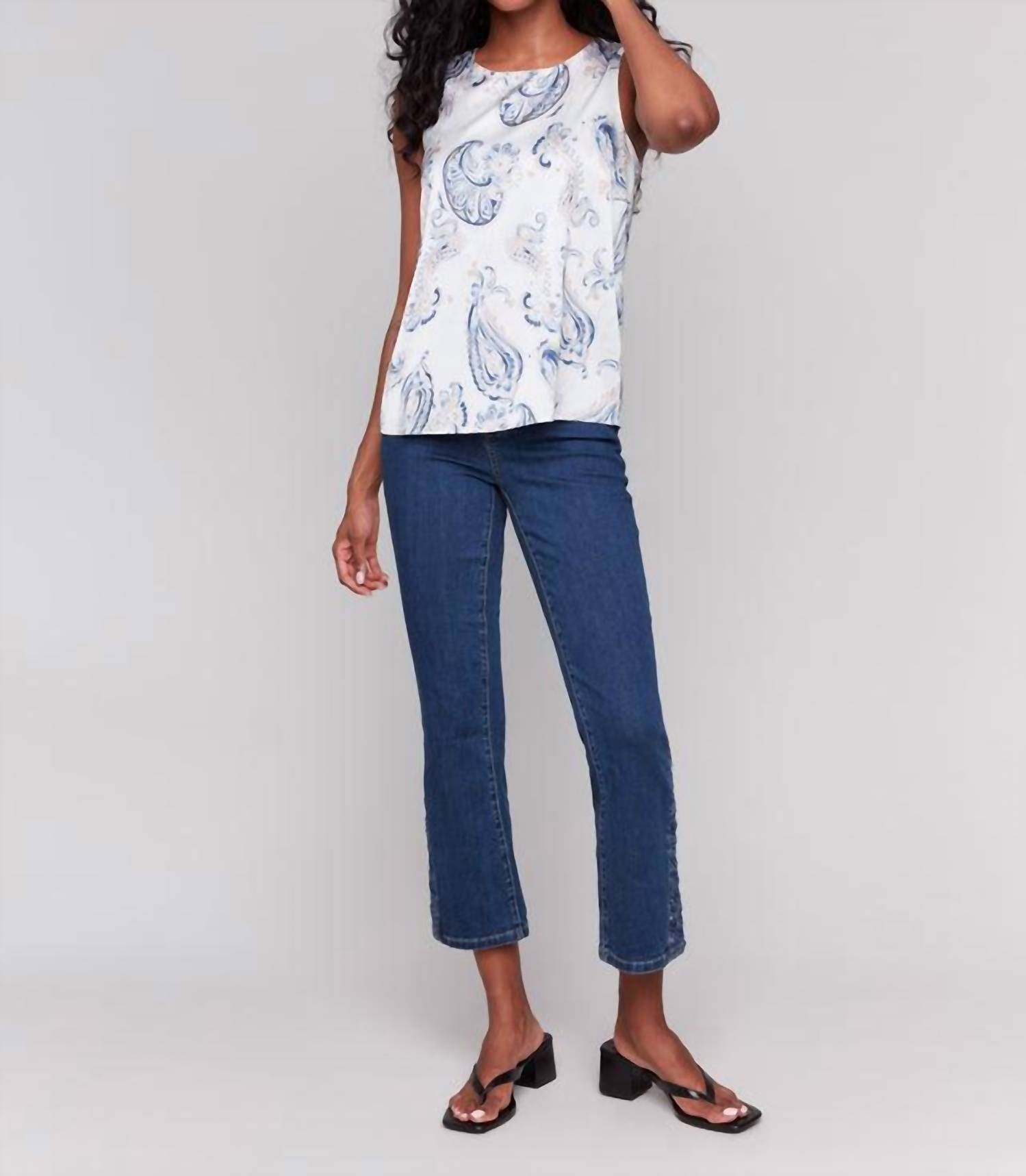 Introducing the Printed Satin Sleeveless Top by CHARLIE B, designed to add a playful yet sophisticated touch to your wardrobe with its watercolor paisley print. This ivory top is crafted from 97% Polyester and 3% Spandex, boasting a garment length of 25 inches. The piece features a crew neckline and a charming keyhole at the center back neck, with a button closure adding to its elegance. Care: Hand wash in cold water, do not bleach, hang to dry, and iron on low if needed.