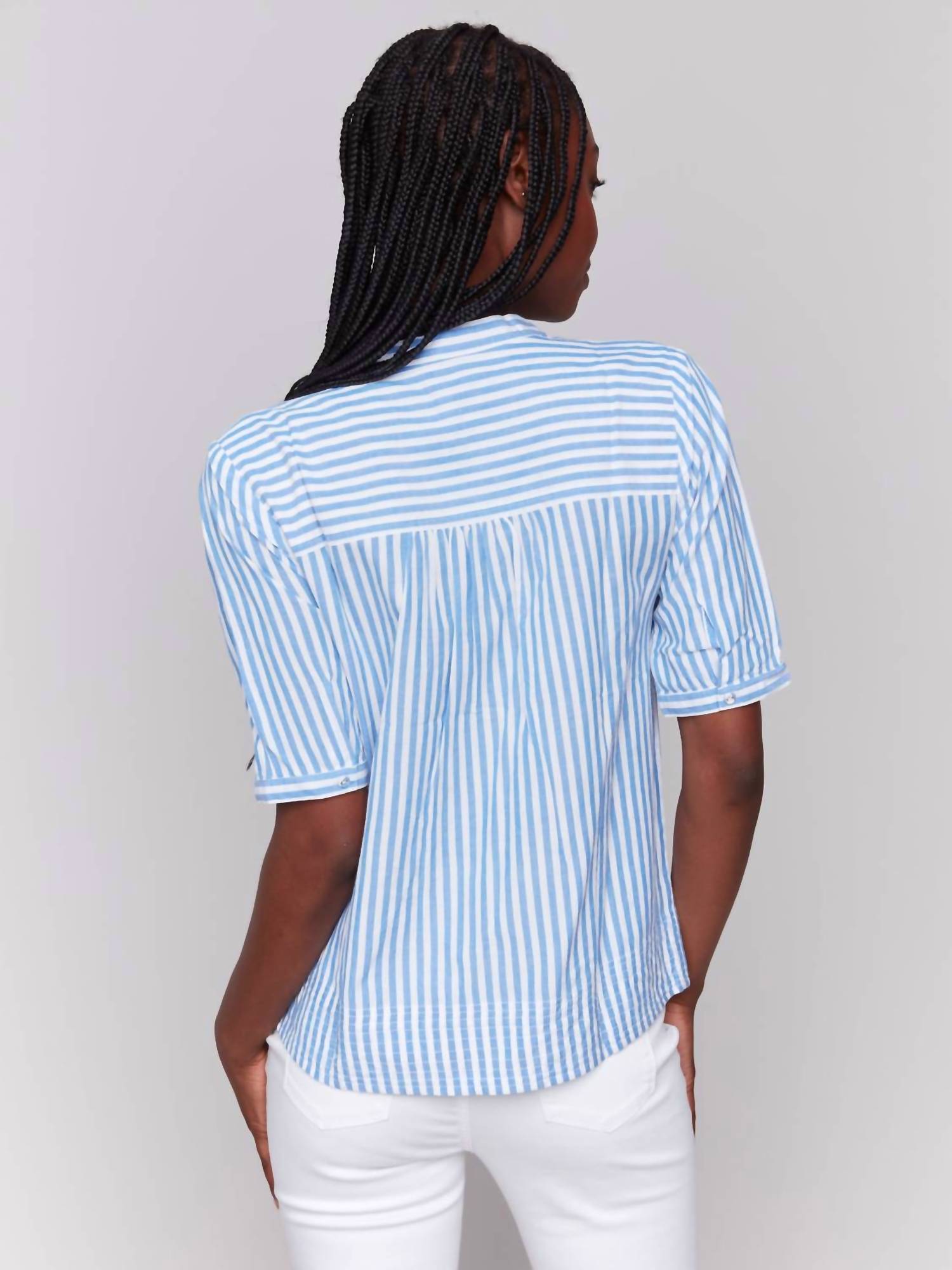 A timeless blouse that will never go out of style. Elevate your summer wardrobe with the Striped Short Sleeve Popover Blouse by CHARLIE B, perfect for a minimalist and vacation-ready look. This blouse features short sleeves and a popover stand collar, with a half placket design for easy pull-on closure. Made from 100% cotton, it showcases a chic blue and white striped pattern, measuring a versatile 24.5 inches in back length. This is your go-to piece for effortless style during any Easter or vacation occasion.