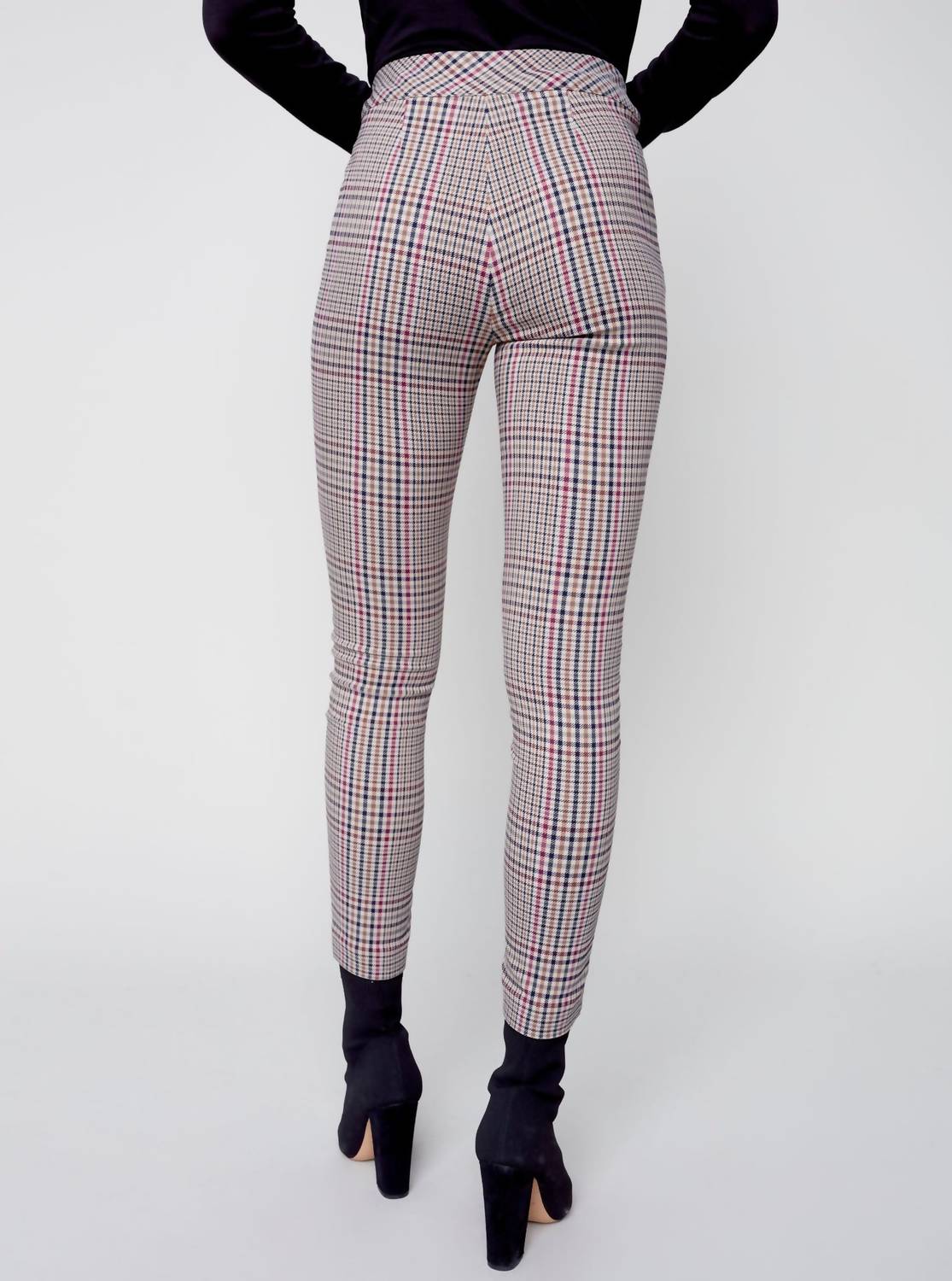 Elevate your wardrobe with the Yarn Dyed Pull On Pant by CHARLIE B, featuring a trendy plaid print perfect for any occasion. These high-rise, slim fit pants offer a sleek, skinny leg and a comfortable, pull-on design. Crafted from a soft and stretchy blend of 73% Rayon, 24% Polyester, and 3% Spandex, they come with a 29" inseam and no pockets for a streamlined silhouette. Care for these stylish pants by machine washing in cold water on a gentle cycle, hanging them to dry, and avoiding bleach.