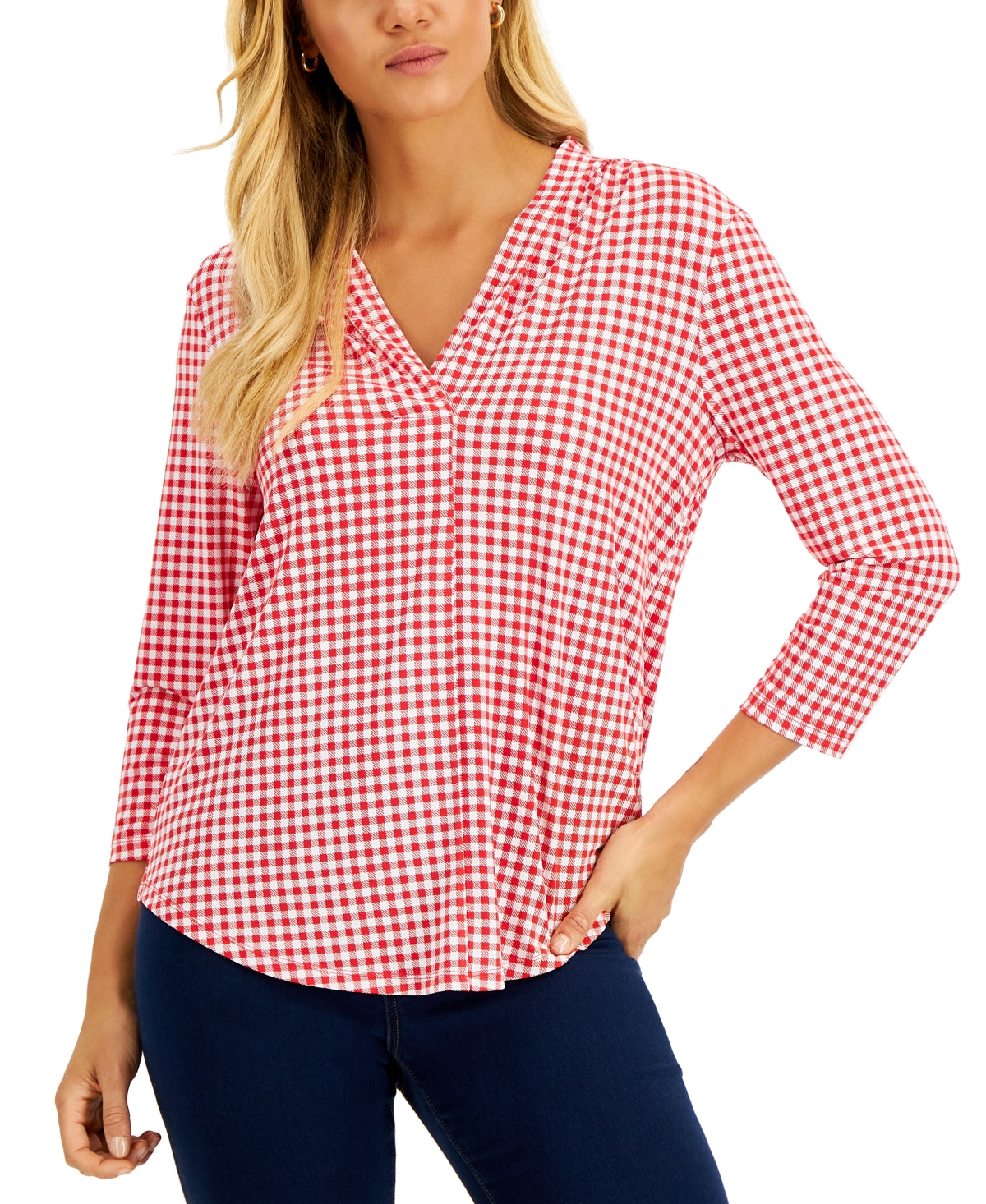 Subtle pleats effortlessly frame the flattering V-neckline of this petite printed top from Charter Club with 3/4-sleeves|