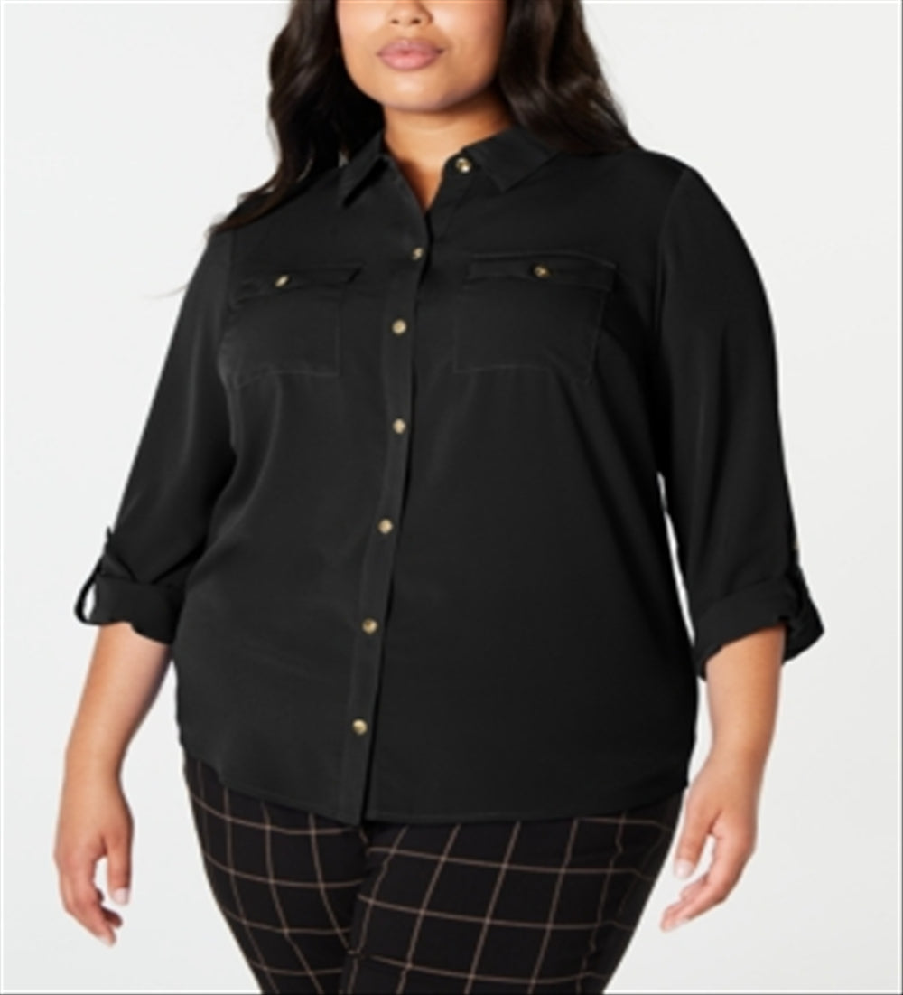 Button up classic coverage and sophistication with Charter Club's plus size collared shirt finished with flap pockets for added polish.| Loose fit; hits at hip | Point collar; button closures at front| Two chest pockets| Roll-up sleeves|