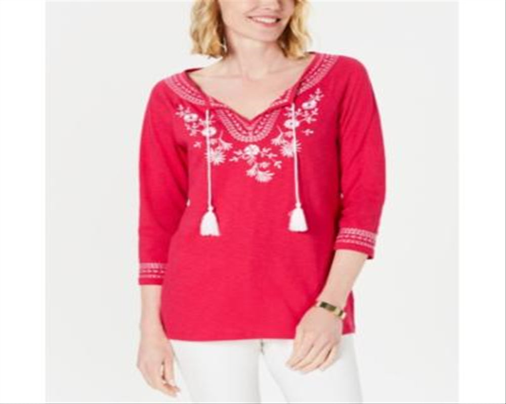 Charter Club Women's Cotton Embroidered Peasant Top Pink Size Petite SM
