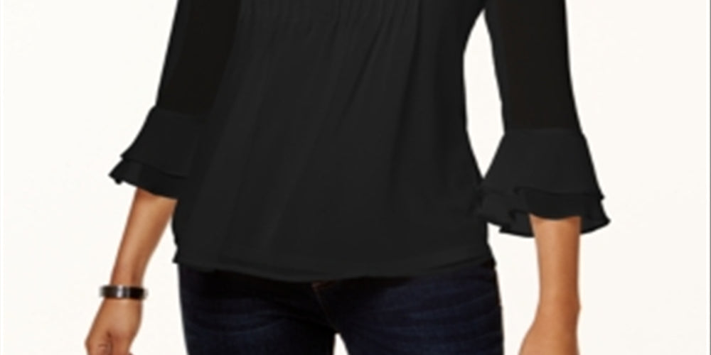 Charter Club Women's Double Ruffle Solid Pintuck Top Black Size Petite S