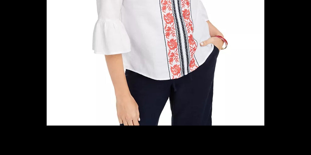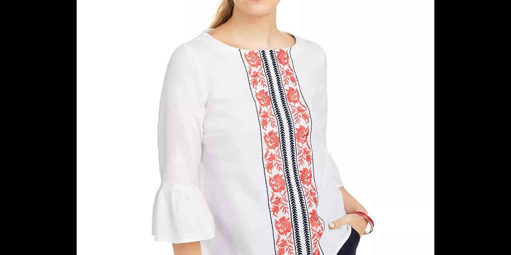 Scoop-neck|Embroidered at front|Bell 3/4-sleeves|Linen/cotton