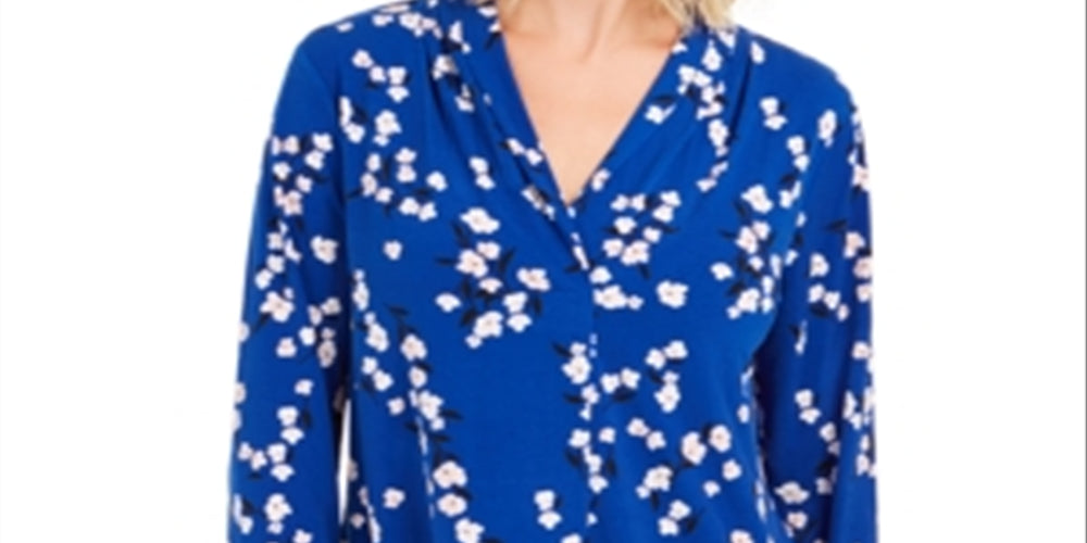 Charter Club Women's Floral Print Pleated V Neck Blouse Blue Size Medium