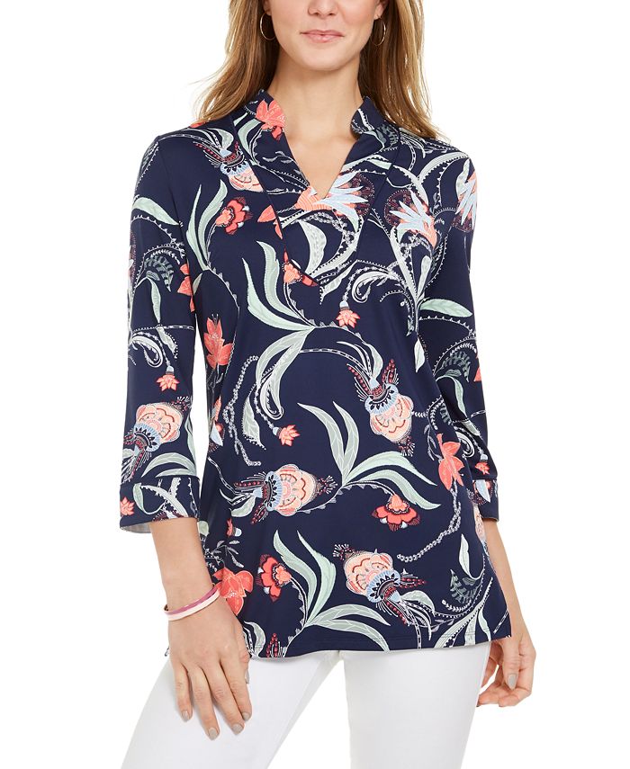Styled with a split neckline and 3/4-sleeves| this paisley tunic top by Charter Clubhits the mark of chic casual comfort.| Relaxed fit; approx. 29 long| Due to generous sizing| we suggest sizing down for the perfect fit| Split neckline