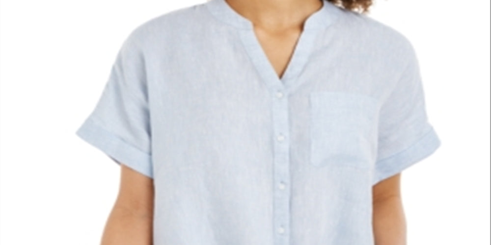 Charter Club Women's Linen Tie Front Button up Shirt Blue Size Small