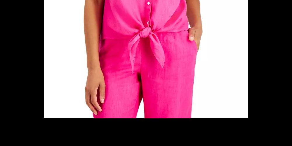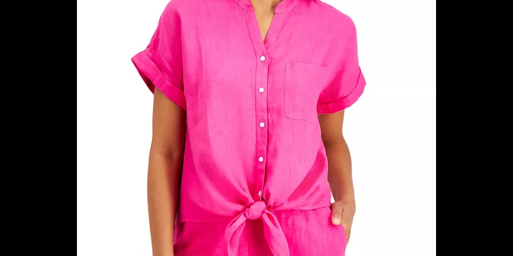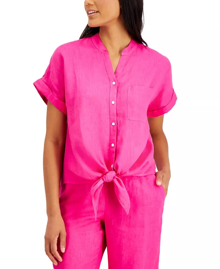 Relaxed fit; hits at hip|Due to generous sizing; we suggest sizing down for the perfect fit|V-neck; front button closures|Self-tie at front hem|Cuffed short sleeves