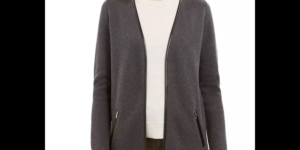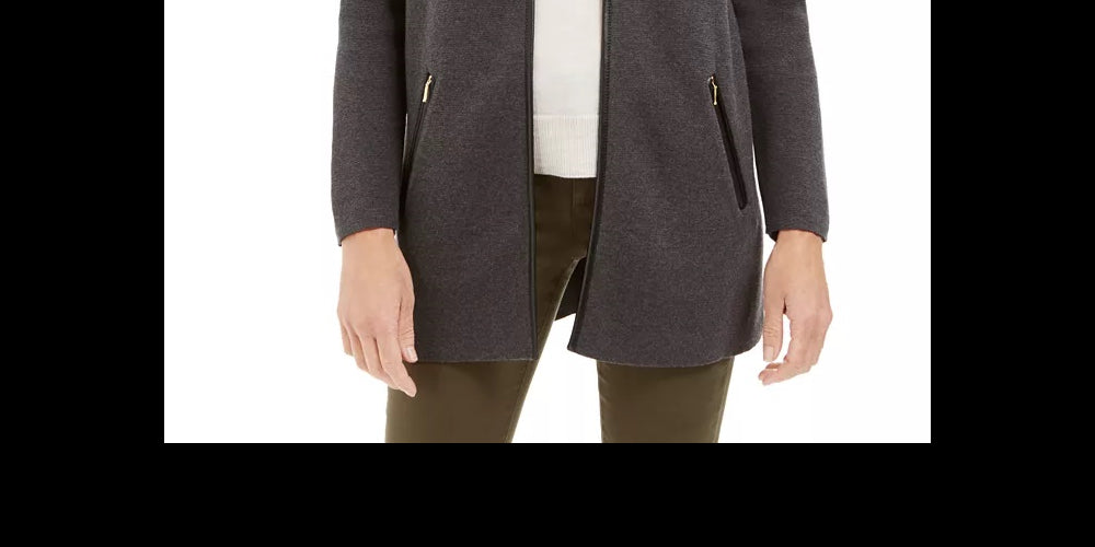 Relaxed fit; approx. 29-1/2 long|Designed to fit and flatter 5'4 and under frame|Open front with faux-leather trim|Slant zippered pockets with faux-leather welt detail at side-front|Shell; cotton; trim; faux leather; polyurethane