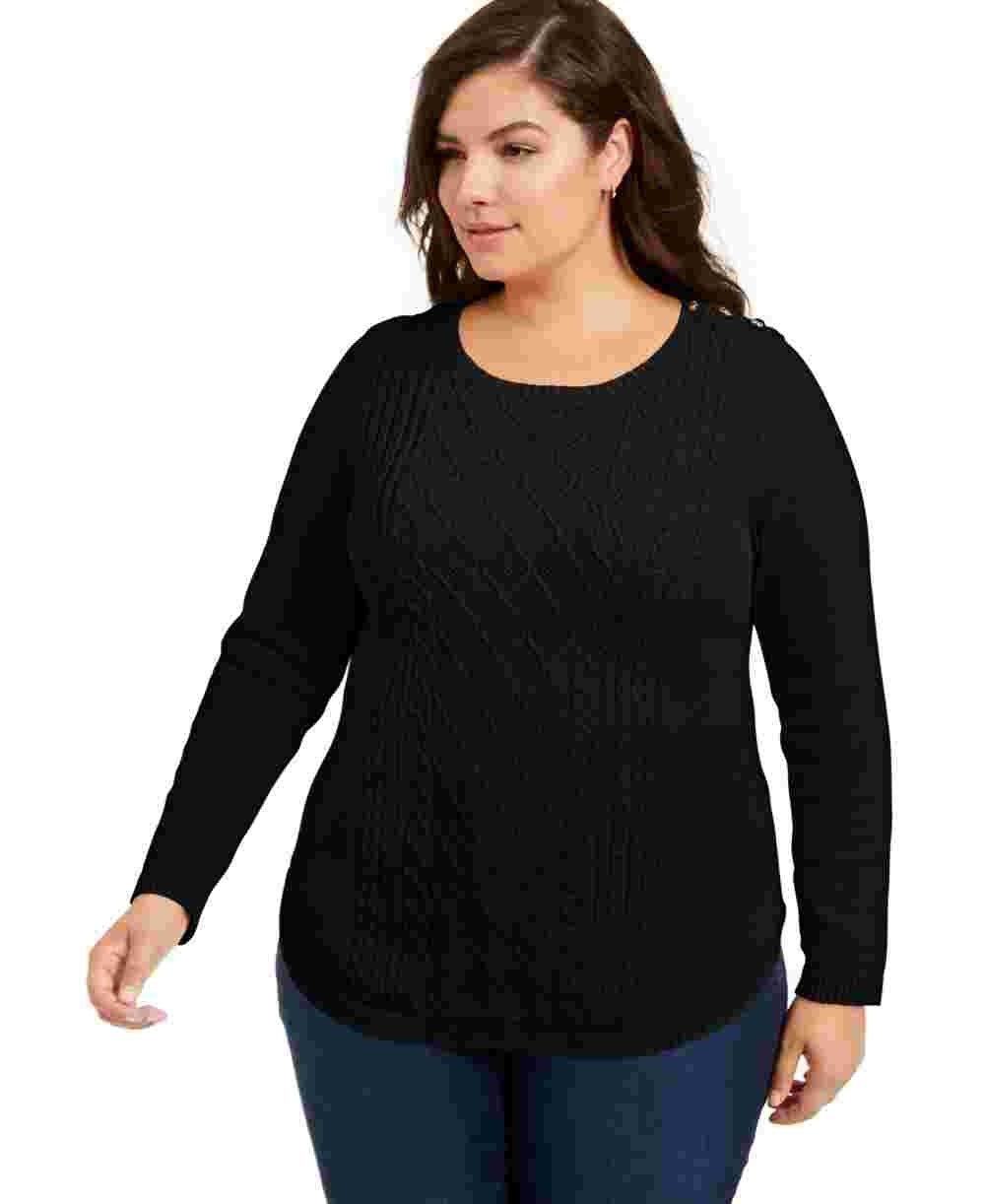 Charter Club Women's Plus Ribbed Trim Button Sleeves Crewneck Sweater Black Size 2X