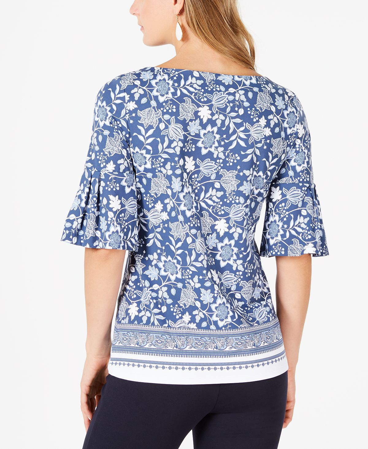 Charter Club Women's Printed Bell Sleeve Top Blue Size Petite L