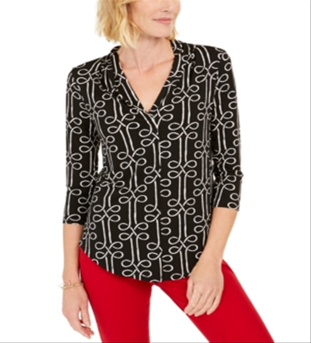 Charter Club Women's Printed V-Neck Top Black Size XS