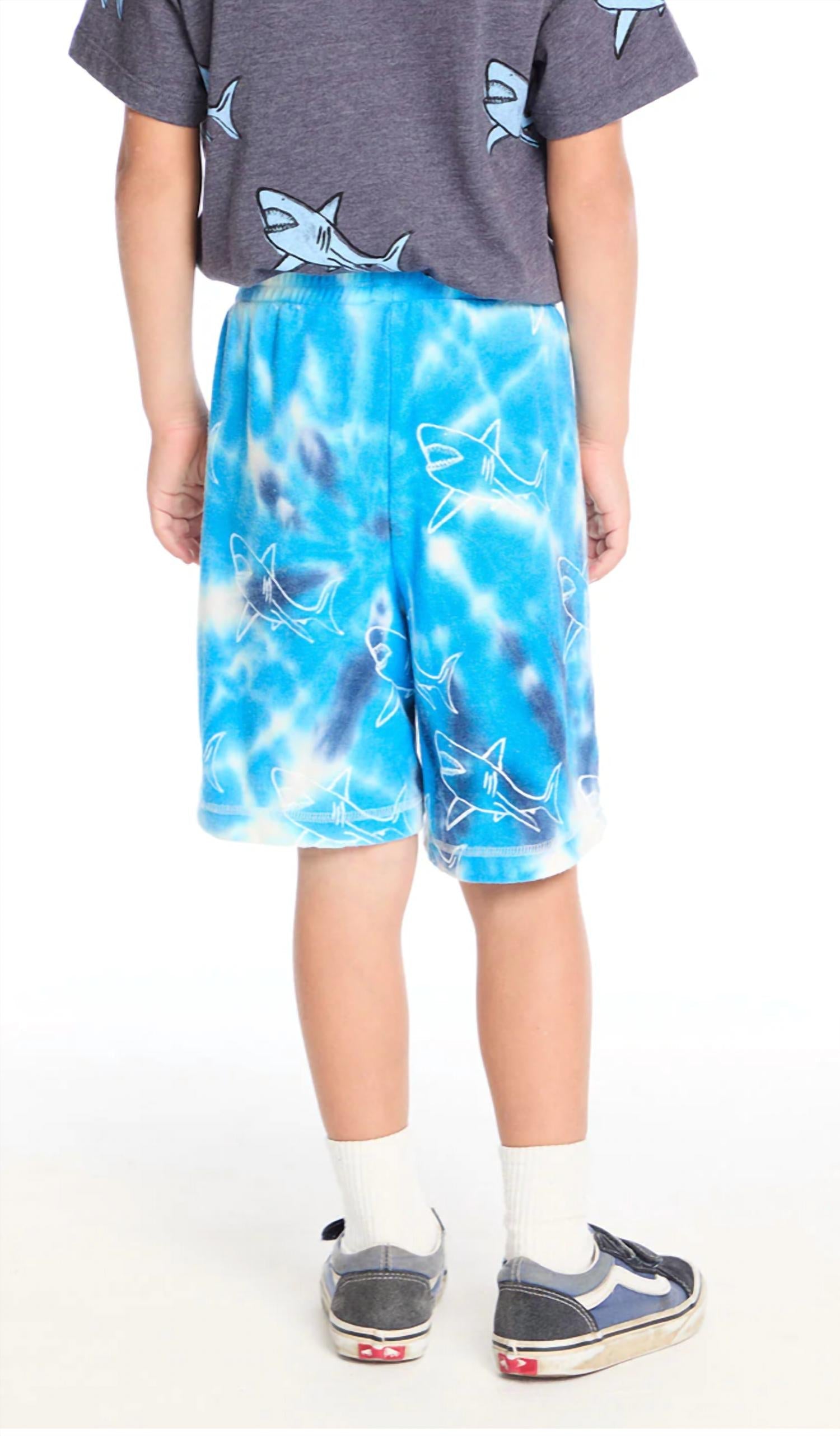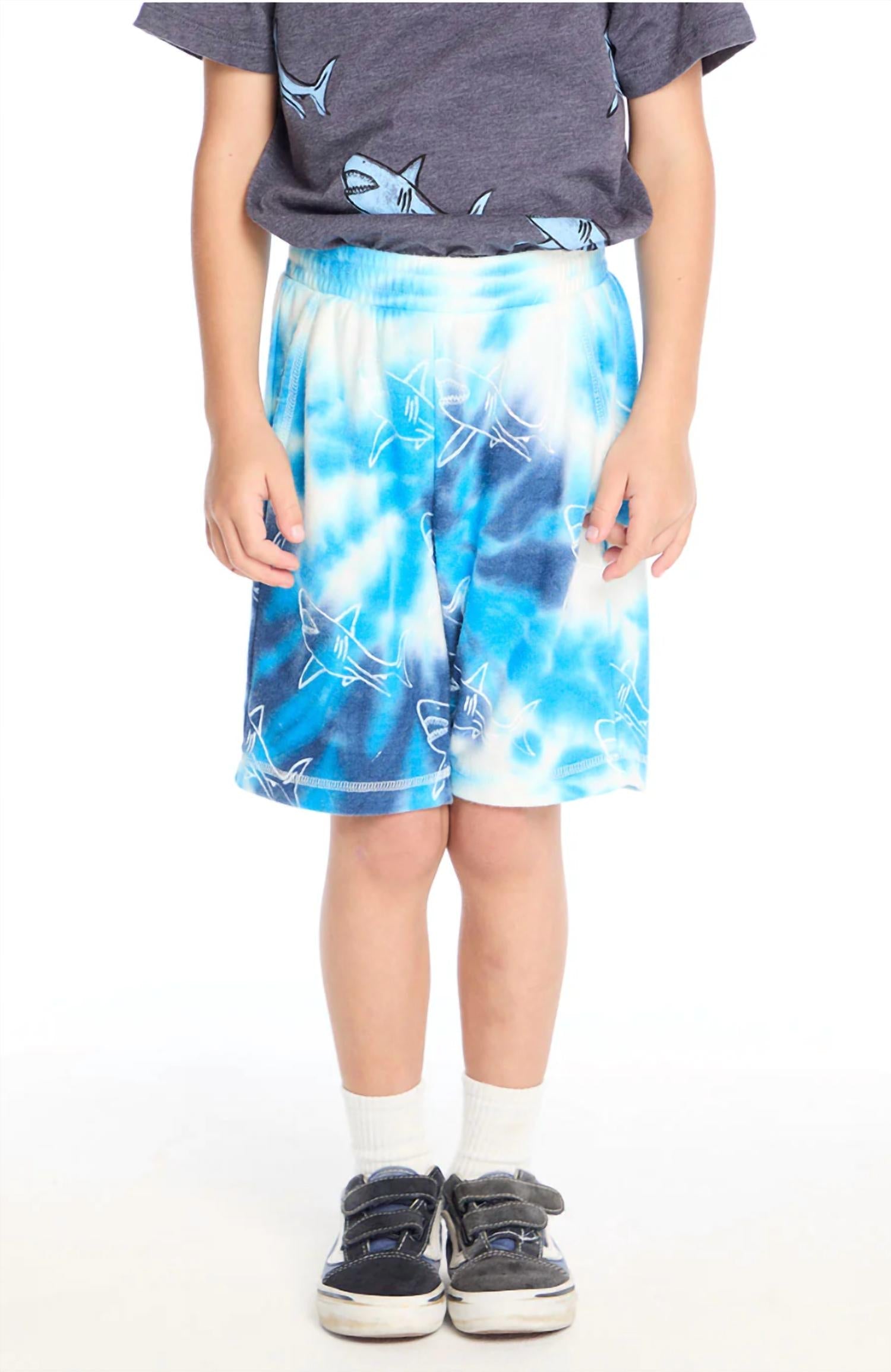 Introducing the Boy's Shark Bite Short by Chaser, perfect for summer adventures in ocean tie-dye. Crafted from a blend of 49% Polyester, 46% Rayon, and 5% Spandex, these shorts offer both comfort and style with their fun pattern. Dive into a playful look by pairing them with the matching Shark Bite tee. Ideal for vacation wear, these shorts will make your little one stand out in the best way.