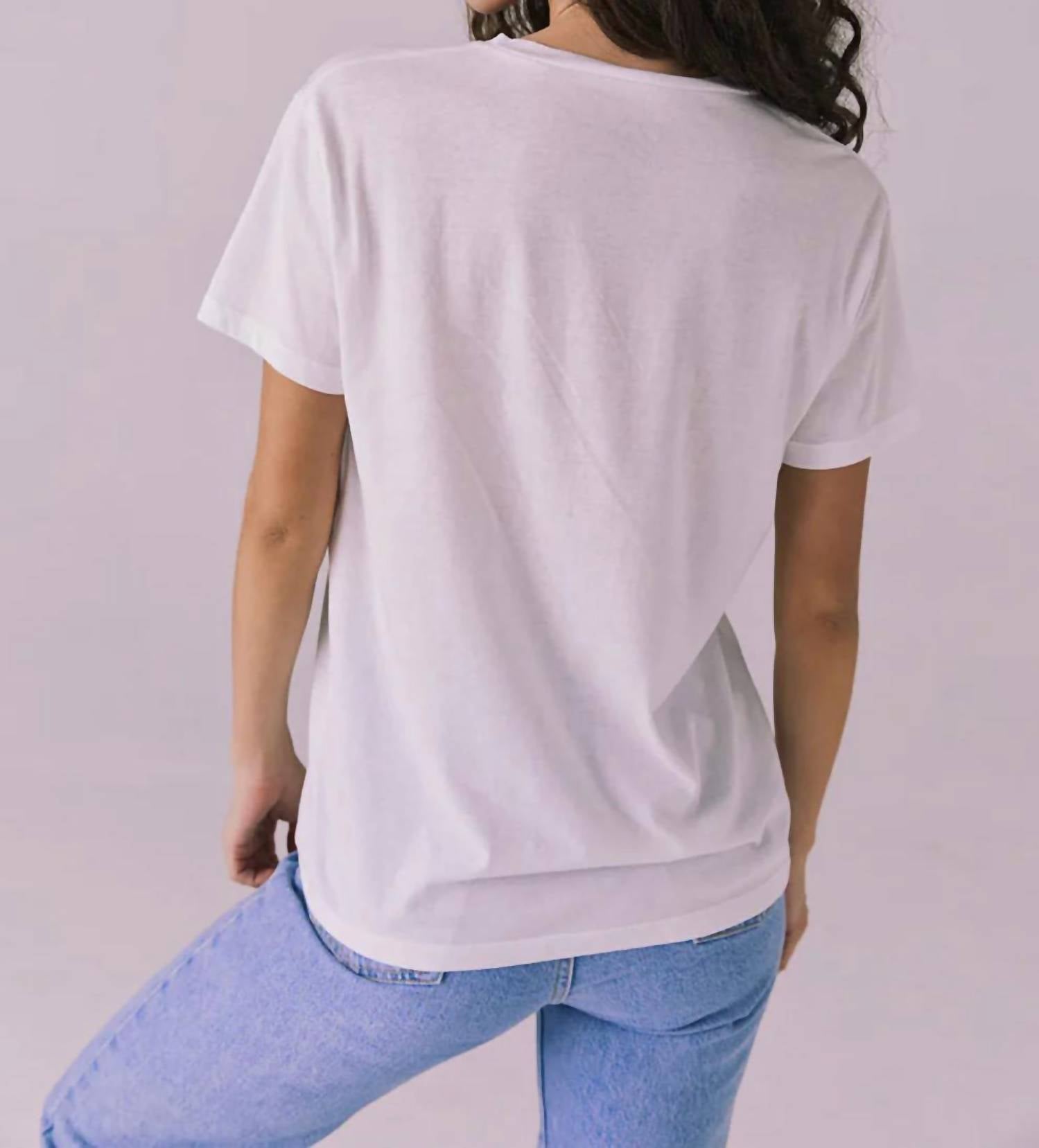 This classic, short sleeve tee will be your go-to staple this season and beyond. Elevate your summer wardrobe with the perfect blend of luxury and nostalgia. Short sleeve graphic crewneck tee. Crafted from 60% cotton and 40% polyester. Features a vintage 70s script on a soft white fabric. Experience effortless style with its pull-on design, perfect for a beach day or casual streetwear. Care for this tee by machine washing cold on the delicate cycle and ironing with low heat. Model is 5'9" and is wearing a size small.