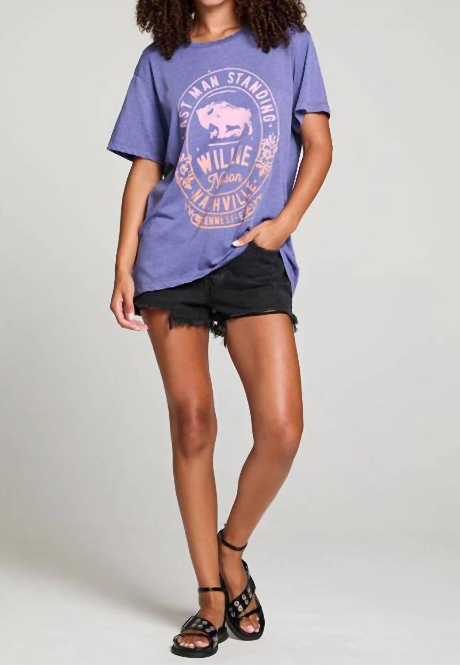 Look no further, you just found your perfect tee! Celebrate your love for music with the Chaser Women's Willie Nelson Last Man Standing Top in a striking purple hue. Crafted from a comfortable 60% Cotton, 40% Polyester blend, this short sleeve tee features a vintage frost blue graphic design with a noble buffalo. Designed as a pull-on style, it embodies a perfect blend of streetwear and vacation vibes. Made for the fashion-forward music enthusiast, this tee is imported and ready to rock your festival look.