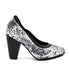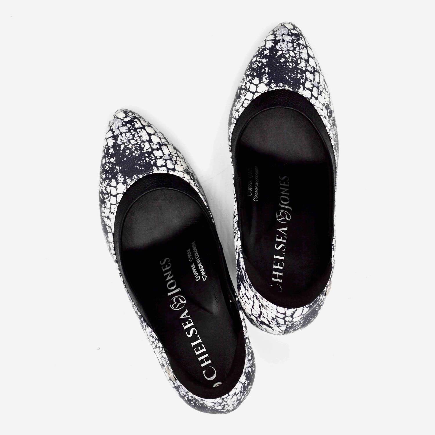 Elevate your style with the Women's Rhythm High Heels by Chelsea Jones, expertly blending elegance with comfort. Crafted with a leather upper and lining, these shoes feature a 3" tapered wood heel with a quiet rubber heel cap, ideal for a graceful, soundless stride. Designed with an almond toe and roomy fit, they offer excellent shock absorption thanks to JONESOLE™ 5mm flexpad rubber sole and cushioned lycra details. Made in Colombia, these black and white print leather heels perfectly suit any summer engagement.