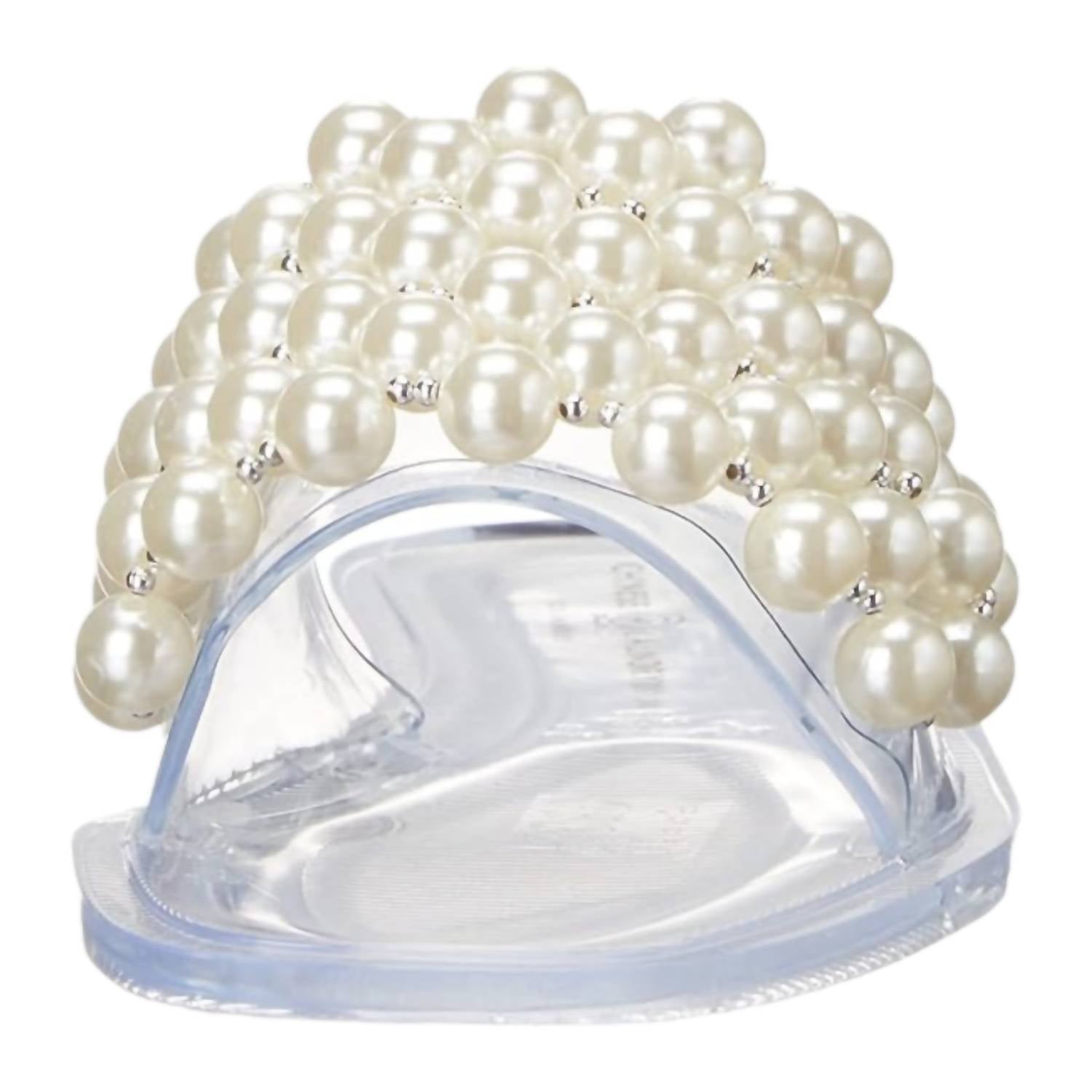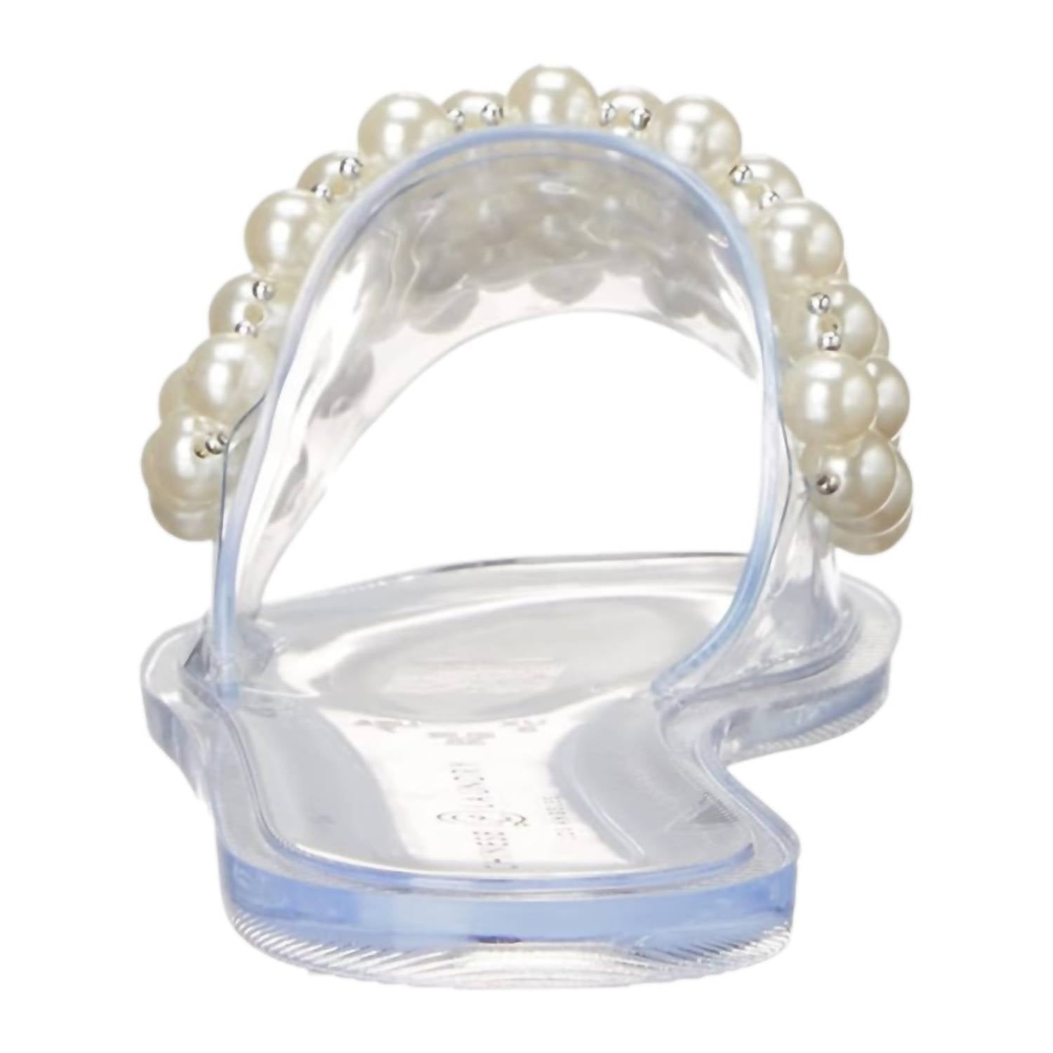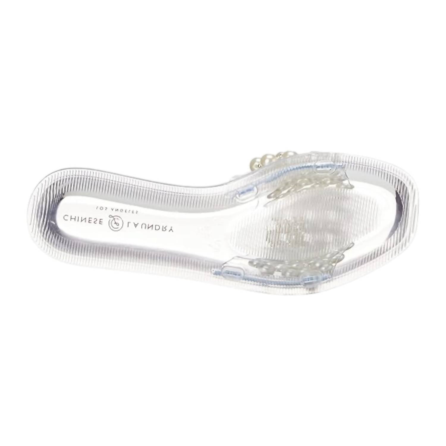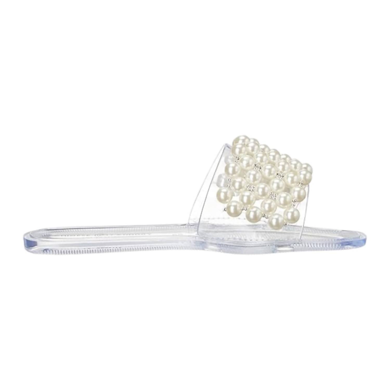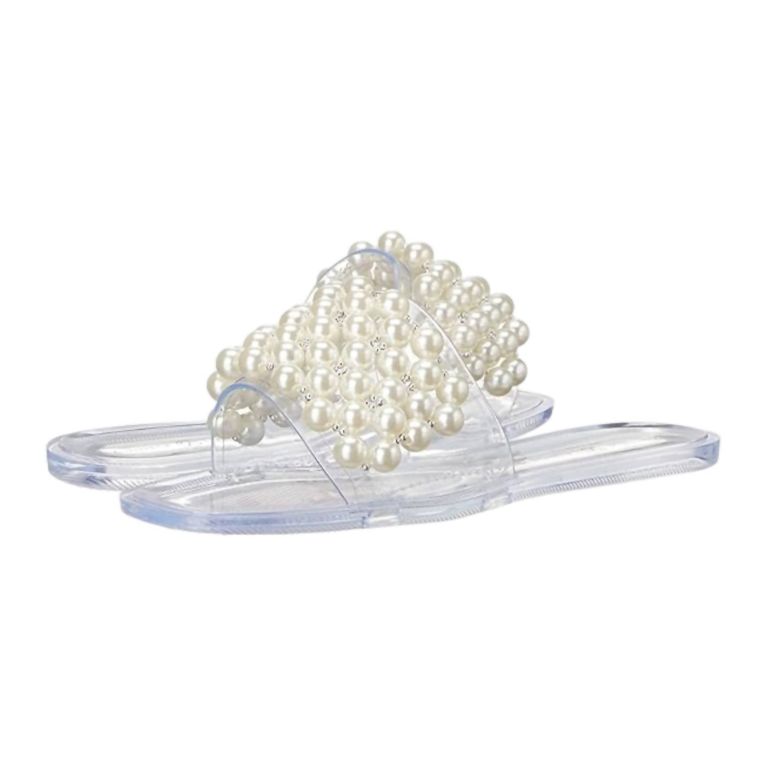 Flowy dresses, cropped pants, and even jumpsuits... this sandal works with them all!Step into a world of effortless elegance. Chic slip-on sandals feature stunning pearl detailing at the band. Crafted with a clear, one-band upper. Offer a modern minimalist aesthetic. Synthetic rubber sole ensures comfort and durability. Not water-resistant. Stylish design and impeccable craftsmanship. Unparalleled style with these effortlessly chic slides.