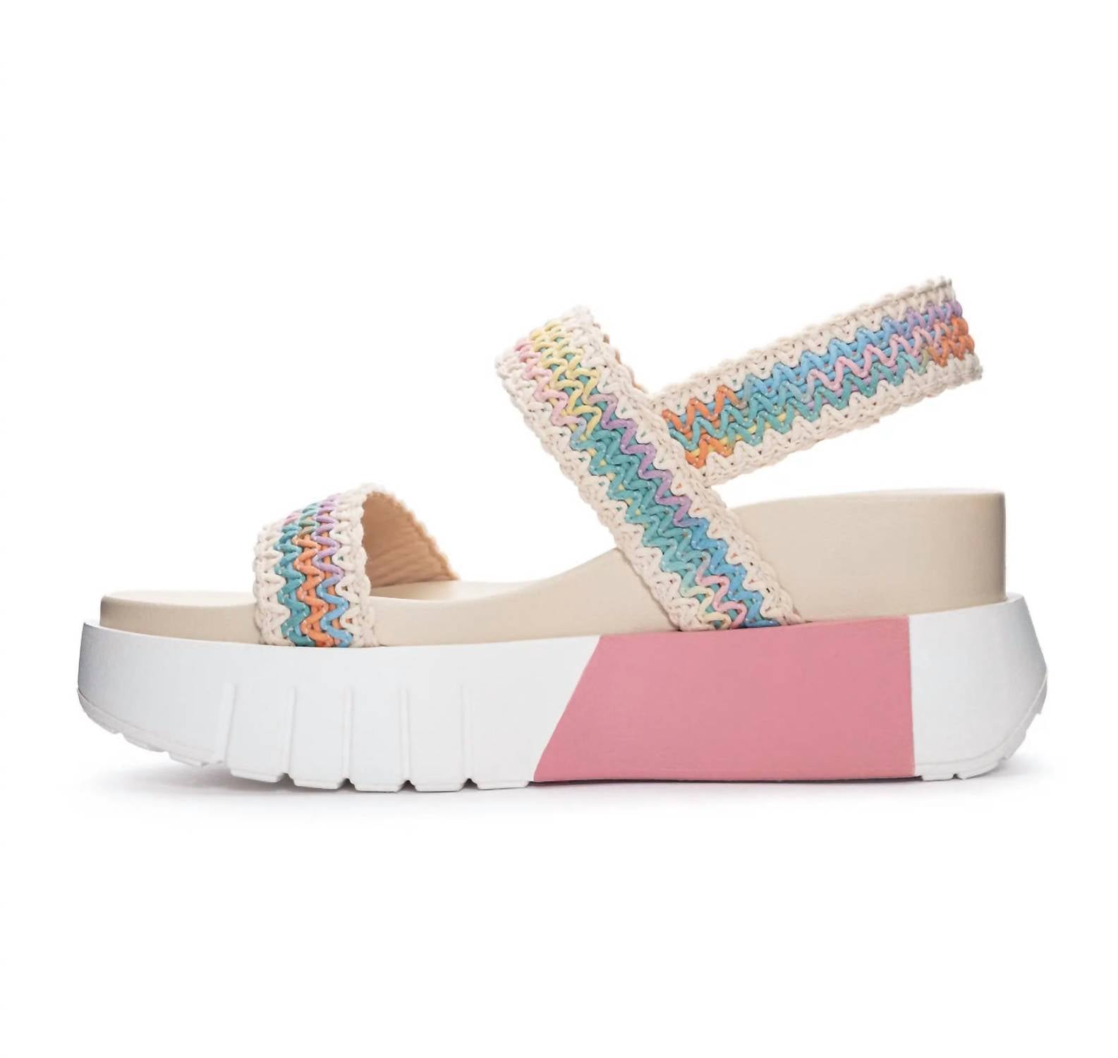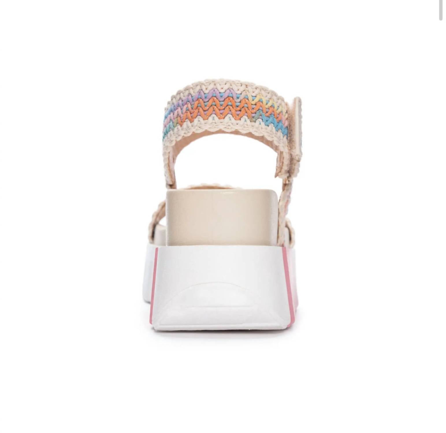 Flowy dresses, cropped pants, and even jumpsuits... this sandal works with them all!Versatile and funky Egan Crochet Sandal. Elevates your warm-weather style. Fabric and manmade materials. 3" heel and 1.75" platform.