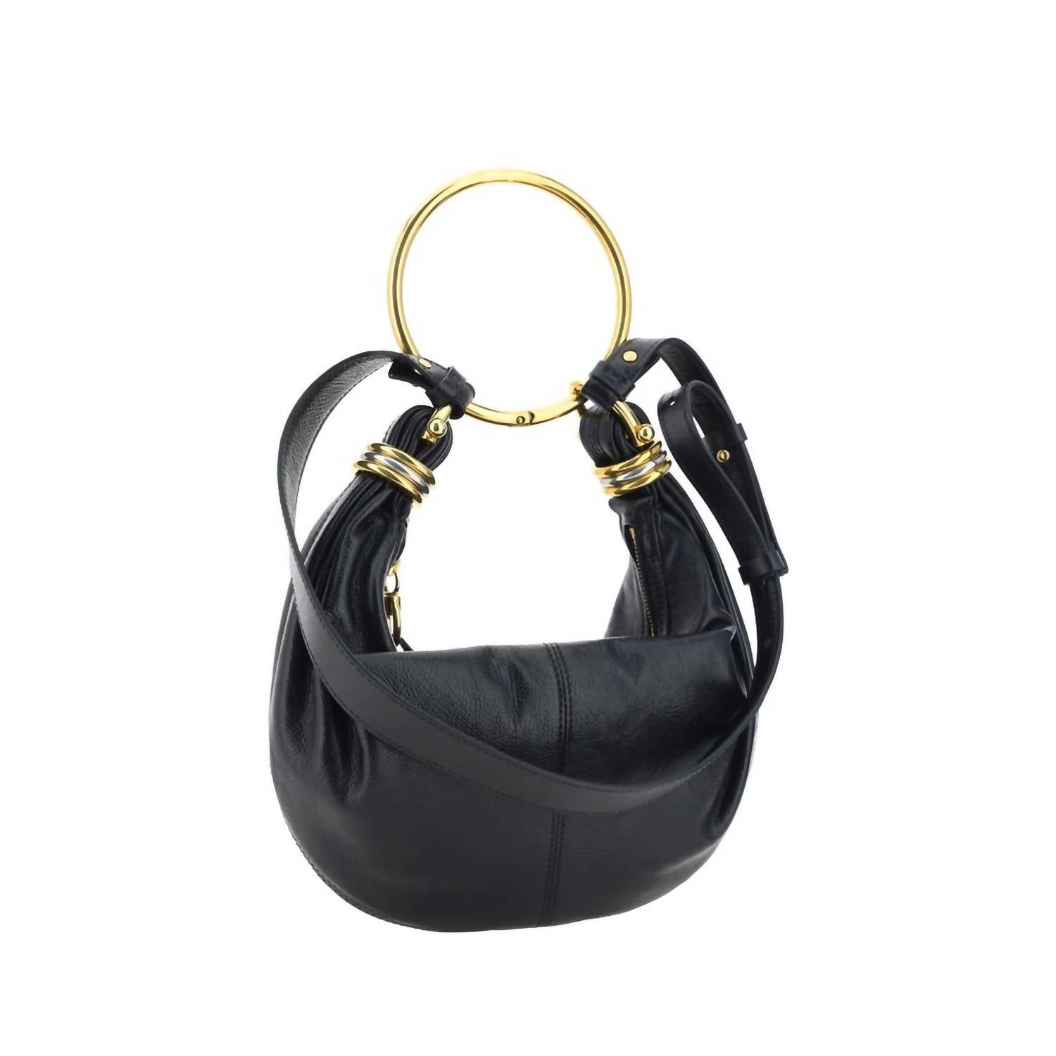 Small in size but a total statement maker. The Women's Bracelet Handbag by Chloé showcases a sleek design in classic black, perfect for the fashion-forward individual. Crafted from 100% Calf Leather, Bos Taurus, this mini bag features a chic round brass handle, an adjustable flat shoulder strap, and a removable top zipper closure. Made in Italy, it offers a single interior compartment to keep your essentials secure. Dimensions: 32x32x10.