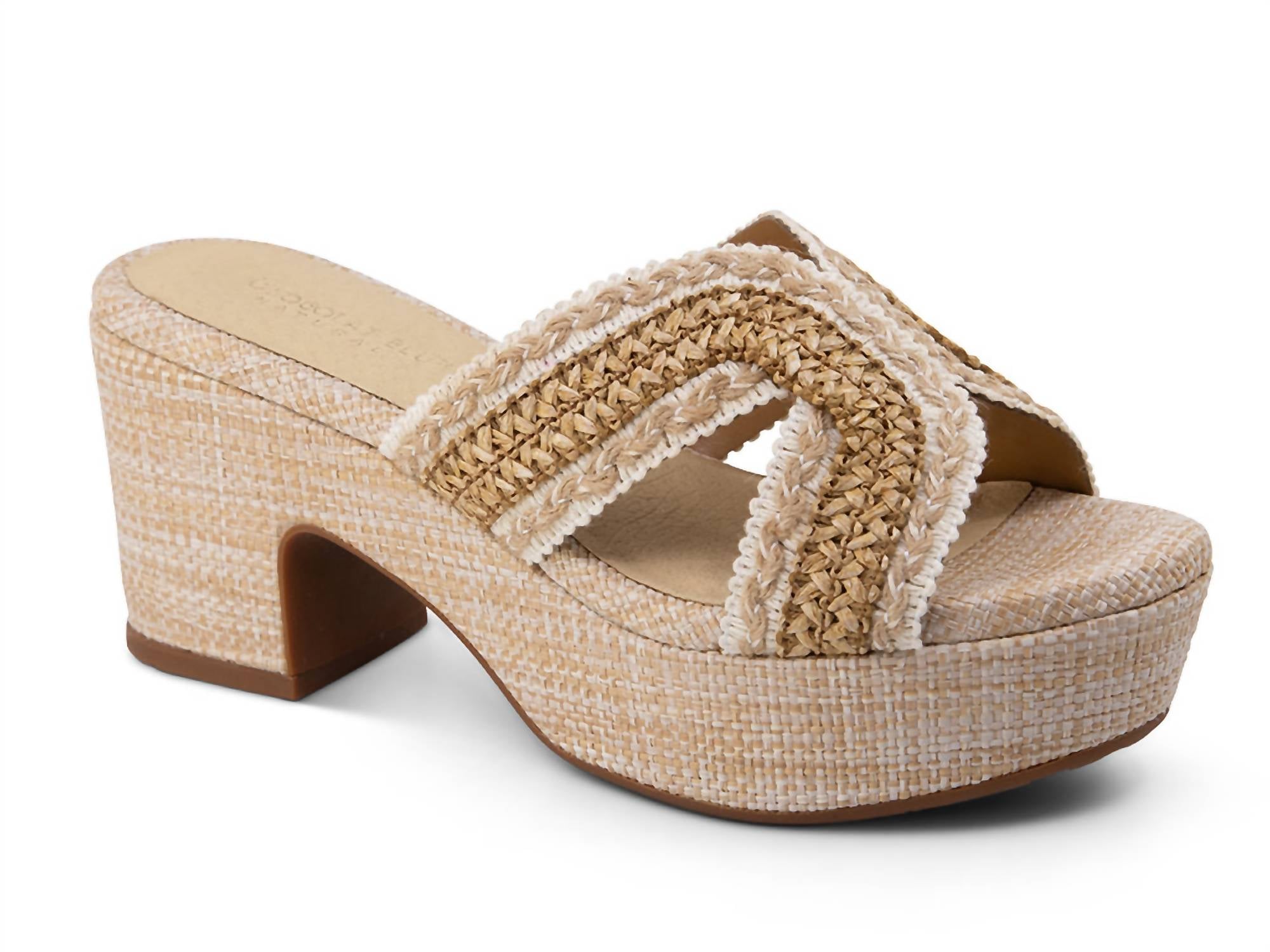 Classicly cute and all-day-wearable. We love this sandal. Introducing the Women's Gen Raffia Sandal by Chocolat Blu, a chic addition to your spring wardrobe in a versatile tan hue. These sandals are crafted in Italy with a raffia upper and leather lining for a premium feel. The design features a comfortable block heel with a 3-inch height and a 1 1/4-inch platform, complemented by a padded footbed and durable rubber outsole. Ideal for engagements and workwear, these sandals offer a true-to-size fit with an elegant open toe silhouette.