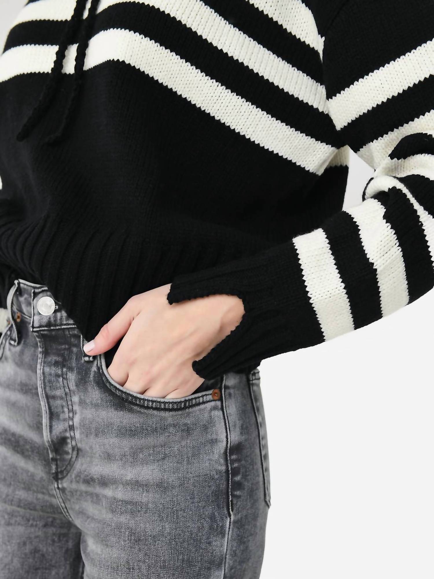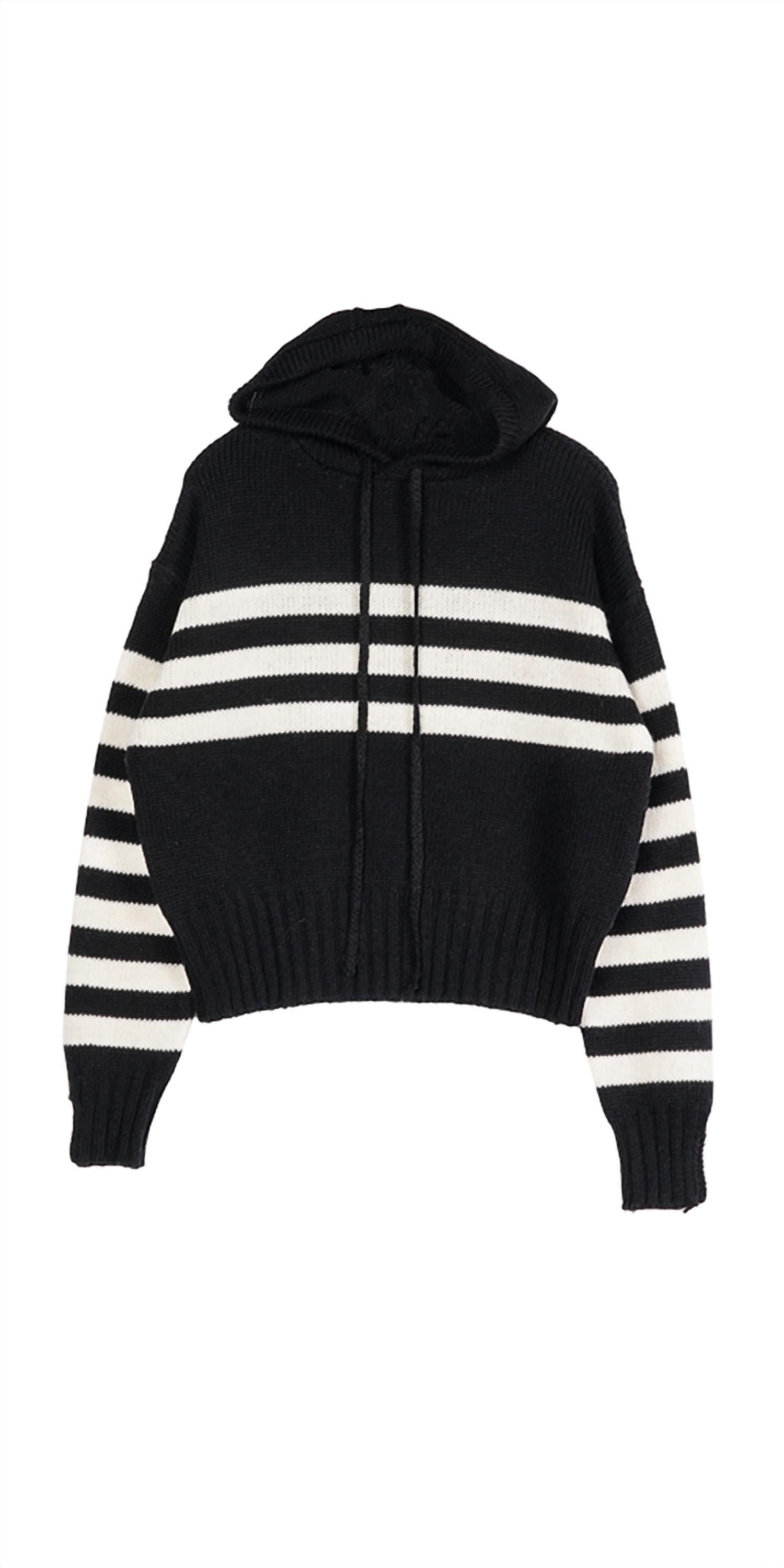 Experience the unparalleled comfort of the Tiago Hoodie by Ciao Lucia, crafted for women in a luxurious merino wool blend. This black hoodie with long sleeves showcases contrasting white stripes, adding a striking touch to its timeless design. Composition: 70% Extrafine Merino Wool, 30% Recycled Polyester, ensuring both coziness and sustainability. The pull-on closure enhances the effortlessly chic look, making it an ideal choice for any occasion.