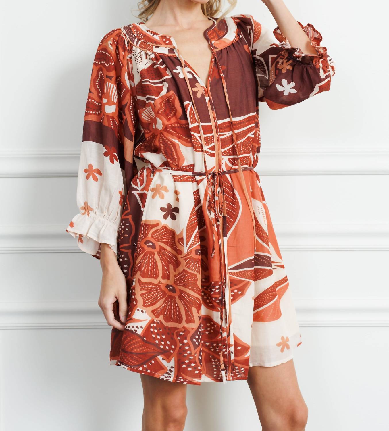 The kind of easy and flattering dress you'll be reaching for all season long. Enhance your style with the CIEBON Christy Printed Mini Dress, radiating boho chic elegance. This dress features three-quarter sleeves and is crafted from a breathable 90% Viscose, 10% Linen, blending comfort with sophistication. Designed with a flattering tie waist and eye-catching graphic print, this brown multi mini dress is ideal for any occasion. Closure: Pull on. Care: Hand wash and lay flat to dry.