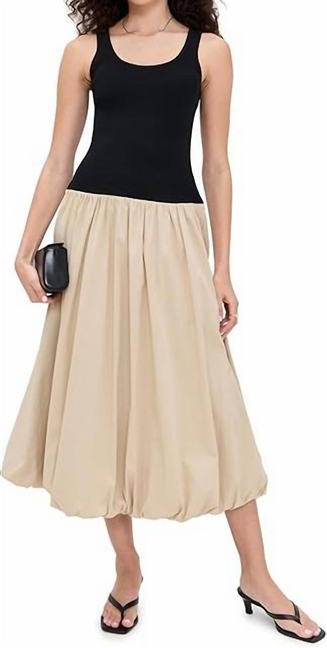 A midi dress so versatile, your options for wearing it are endless. Elevate your wardrobe with the Nera Midi Dress by Cinq à Sept, crafted in a chic two-tone Black/Khaki. This sleeveless dress features a sophisticated scoop neck and a fit-and-flare silhouette, perfect for making a statement on special occasions, including Valentine's Day or an anniversary. Designed for quiet luxury, its composition of 70% Viscose and 30% Sorona ensures comfort and elegance. Originating from imported craftsmanship, it is a pullover style best cared for with dry cleaning.