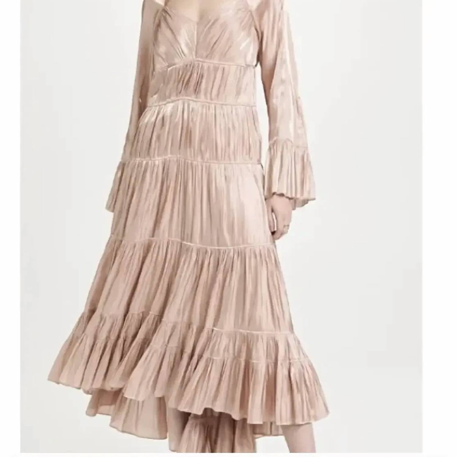 Discover the Nina Tiered Satin Midi Dress by Cinq à Sept, an elegant creation for your next wedding event or New Year's Eve celebration. Featuring long sleeves with flounce cuffs, this dress is crafted from 100% polyester lightweight, non-stretch satin, boasting a striking metallic finish. Designed in a tiered A-line silhouette with a high-low hem, it highlights a sweetheart neckline and gathered seams. Closure features include a hidden zipper at the back and a hook-and-eye with a keyhole detail, while care is simple with hand wash instructions.