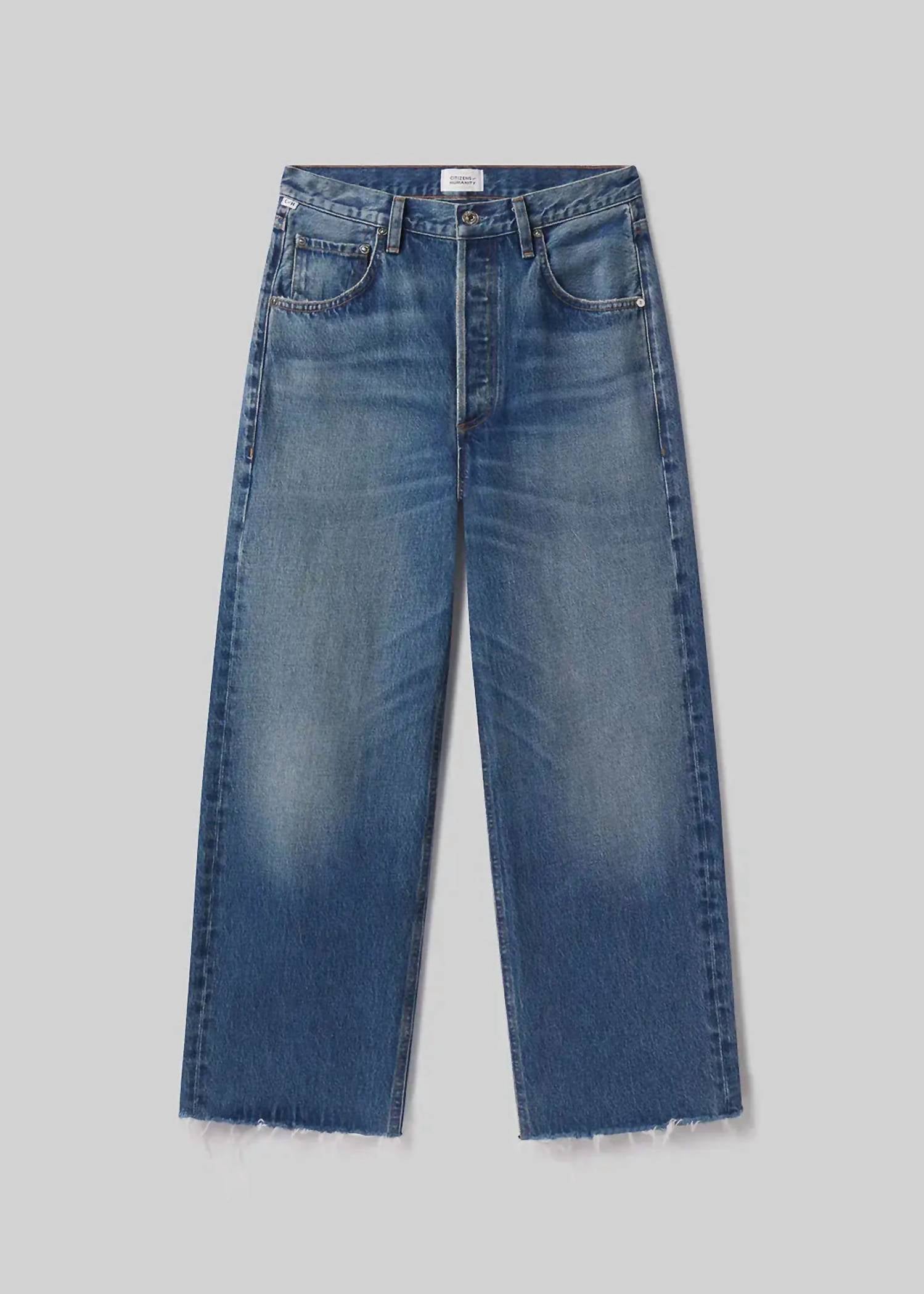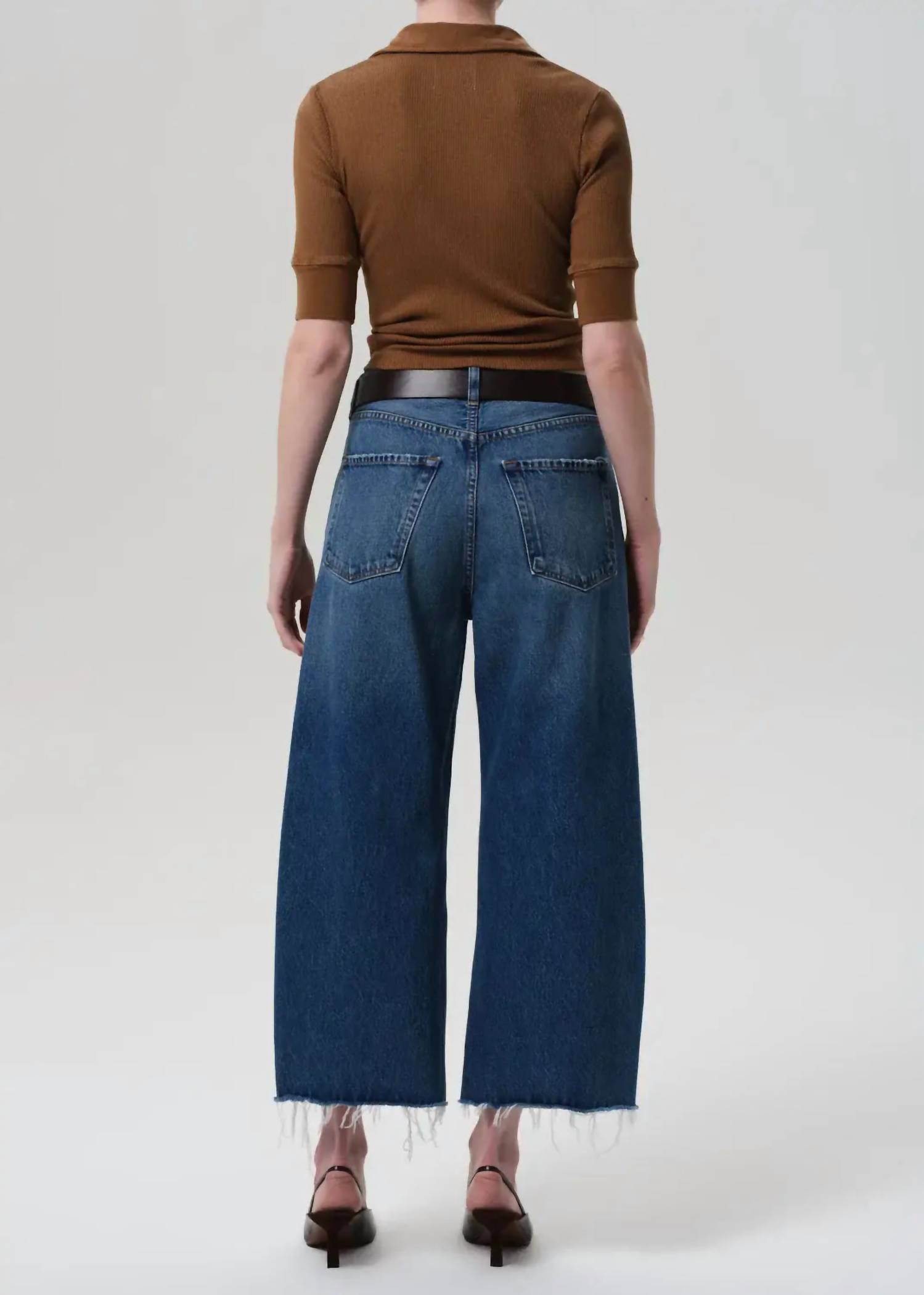 Comfortable and stylish, we love this cropped jean for all of the obvious reasons. Presenting the Ayla Raw Hem Crop Jeans by Citizens of Humanity, a minimalist statement in women's fashion. With a relaxed wide-leg fit, these jeans feature a cropped 25" inseam and a casual 12.5" rise, perfect for a dinner party or everyday wear. Crafted from 100% regenerative cotton in the Chaya wash, they showcase a medium-light indigo with marbling and a raw hem. Originating from Turkey, the jeans are finished with a button fly closure and can be machine washed cold and tumbled dry on low for easy care. Model is 5'10" and wearing a size 27.