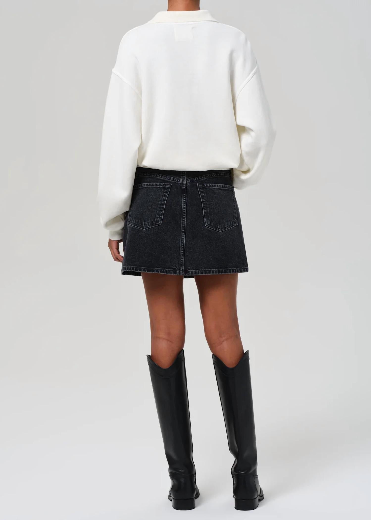Show just the right amount of leg in this fit flattering mini. Introducing the Brita Mini Skirt by Citizens of Humanity, a perfect addition to your summer streetwear collection. This stylish skirt, made from a 98% Cotton and 2% Polyurethane blend, offers a slim fit and is crafted in the USA with imported materials. With its 15" garment length, welt pockets, and a sleek silhouette in a washed black aesthetic, it promises both comfort and sophistication. Closure: Zipper Fly. Care: Machine wash cold. Model is 5'10" and wearing a size 27, ensuring a true-to-size fit for all-day wearability.