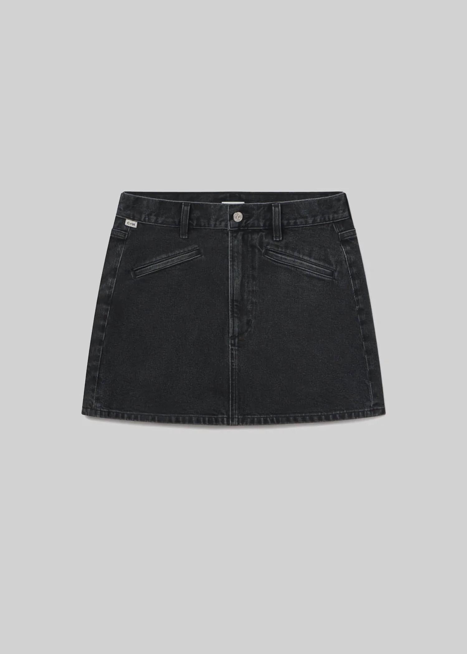 Introducing the Brita Mini Skirt by Citizens of Humanity, a perfect addition to your summer streetwear collection. This stylish skirt, made from a 98% Cotton and 2% Polyurethane blend, offers a slim fit and is crafted in the USA with imported materials. With its 15" garment length, welt pockets, and a sleek silhouette in a washed black aesthetic, it promises both comfort and sophistication. Closure: Zipper Fly. Care: Machine wash cold. Model is 5'10" and wearing a size 27, ensuring a true-to-size fit for all-day wearability.