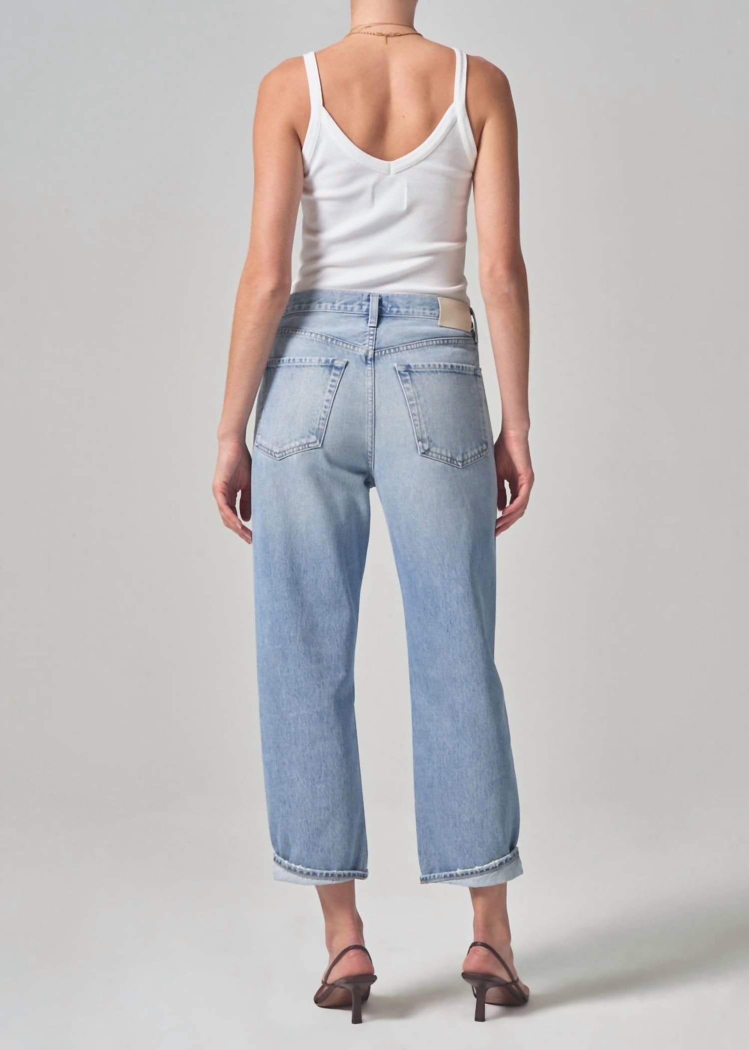 Fit to perfection, we love these high-waist jeans and you will too. Introducing the Dahlia Bow Leg Baby Roll Jeans by Citizens of Humanity, designed for effortless style and comfort. These relaxed fit jeans feature a high rise waist of 11.875" and a 25.5" inseam, with a charming vintage leg that slightly tapers down to an ankle-high 15.75" leg opening. Crafted from 100% regenerative cotton in a textured light vintage indigo, they offer a non-stretch, rigid feel with fading and whiskering details. Originating from Turkey, these jeans boast a button closure and are machine washable inside out, with a tumble dry on low to ensure easy care. Model is 5'10" and is wearing a size 27.
