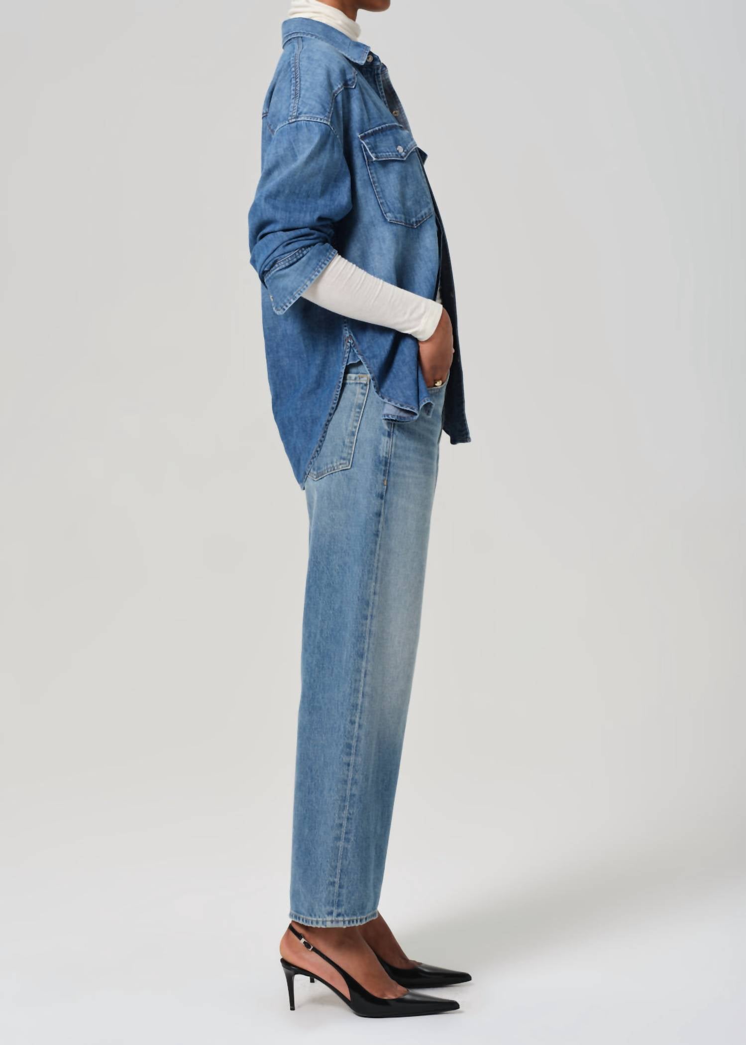 Pair these wide leg jeans with mules, slides or your favorite strappy sandals. The Gaucho Vintage Wide Leg Jeans by Citizens of Humanity are a stylish nod to retro fashion, crafted for effortless elegance in Sodapop. These high-rise jeans, made from 100% regenerative cotton, offer a relaxed fit with a loose, wide leg silhouette and feature a button fly closure. They boast a 12.75" rise, 26.5" inseam, and 21" leg opening, showcasing organic, midweight non-stretch denim with a light wash and slight fading. Care for these jeans by machine washing cold inside out with like colors. Made in the USA with imported materials, they're perfect for women looking to embrace the streetwear trend this summer.