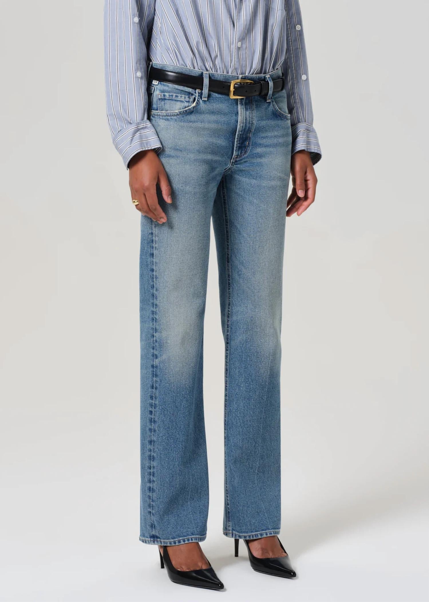 A boot-cut jean that not only looks good on, you'll be comfortable in them all day. Discover the Genova Low Rise Boot Cut Jeans by Citizens of Humanity, designed for a relaxed fit and effortless style. Featuring a low-rise waist with a rise of 9 7/8" and a bootcut leg opening of 18 1/2", these jeans are crafted from a soft blend of 98% cotton and 2% polyurethane, ensuring all-day comfort and wearability. The medium wash Clairo shade with whiskering and fading adds a vintage 90s touch, perfect for spring travel occasions. Closure: Zipper fly. Care: Machine wash. Model is 5'10" wearing a size 27.