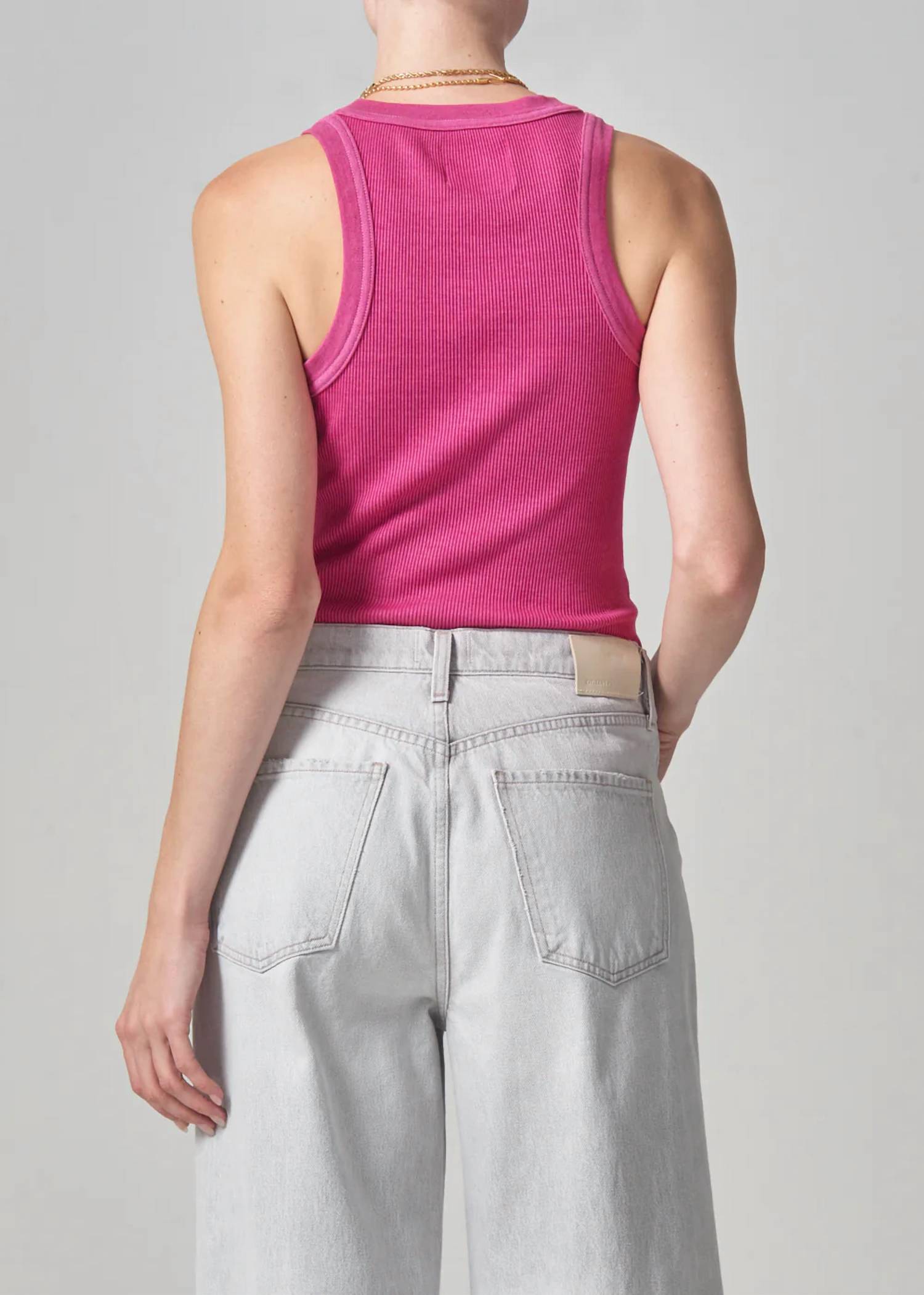 The Isabel Ribbed Tank by Citizens of Humanity is a versatile piece in vibrant Viola, perfect for both standalone wear or layering. This sleeveless racerback tank features a high neckline and cutaway armholes, crafted from a blend of 49% Tencel Lyocell, 49% Organic Cotton, and 2% Spandex, offering optimal breathability and stretch. Made in the USA with imported materials, its pull-on design ensures a sleek fit with measurements of 21 1/4" body length and a 25 1/2" waist. Care instructions: Machine wash cold to maintain its ultra-soft and supportive texture. Model is 5'10" and wears size Small (27" total chest, 10 1/2" shoulder to shoulder).