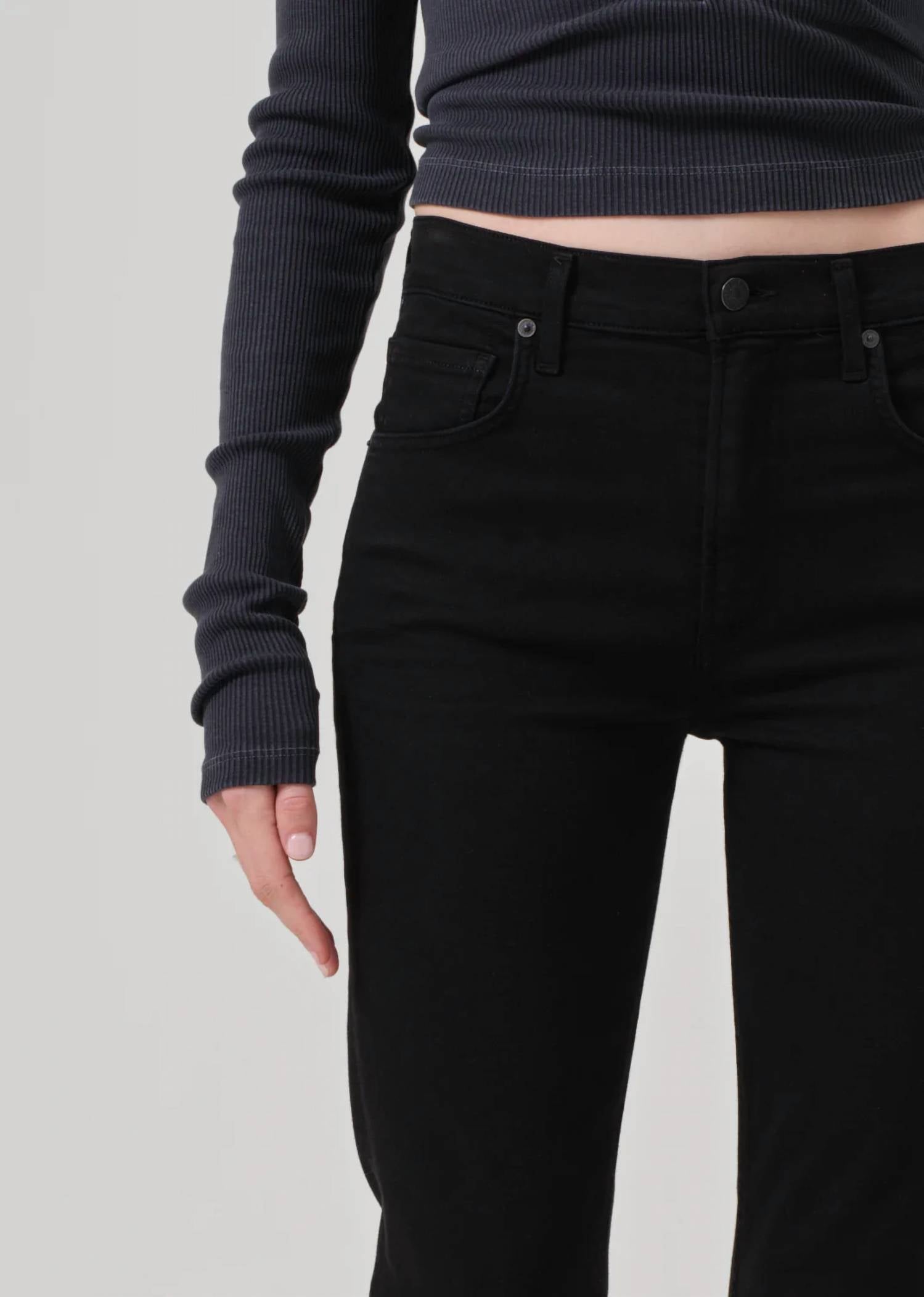Just add boots! Introducing the Isola Mid Rise Cropped Boot Jeans by Citizens of Humanity, a stylish choice for those seeking an ultra-comfortable fit. These women's jeans offer a true-to-size, bootcut silhouette with a plush black stretch denim that hugs and shapes your body. Composition includes 88% cotton, 10% polyester, and 2% spandex, featuring a classic zip fly closure. Care for these jeans is easy with machine wash cold instructions and low tumble dry. The model is 5'10" and wears a size 27, with a rise of 11 1/4”, inseam of 26 1/2", and a leg opening of 16 1/2".