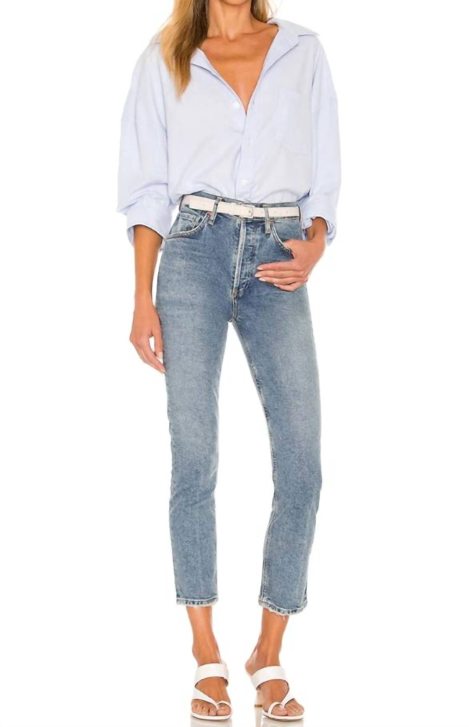 This classic straight leg jean has a perfect fit and goes with just about everything. Elevate your summer style with the Jolene High Rise Vintage Slim Jeans by Citizens of Humanity, crafted in a classic Straight Leg design. These vintage-inspired jeans feature a light wash with light whiskering and an intentionally frayed hem, made from 98% Cotton and 2% Polyurethane. Proudly made in Turkey, this piece offers timeless 5-pocket styling and a button fly closure for a perfect fit. Care for these beautiful Dimple Denim jeans is easy with machine wash instructions.