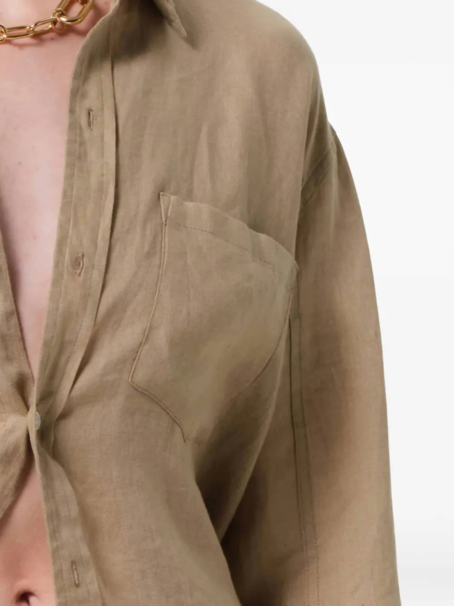 The Kayla Shrunken Linen Shirt by Citizens of Humanity combines style and comfort with its long sleeves and 100% linen composition, offering a breathable, lightweight feel. Designed with a solid Gobi color, it features a slightly more fitted silhouette, maintaining a timeless drop shoulder and perfect drape. This button closure shirt, made in the USA, is ideal for any spring travel wardrobe and complements a minimalist look seamlessly. Care for your shirt by machine washing it inside out with like colors, avoiding bleach, and tumble drying on low.